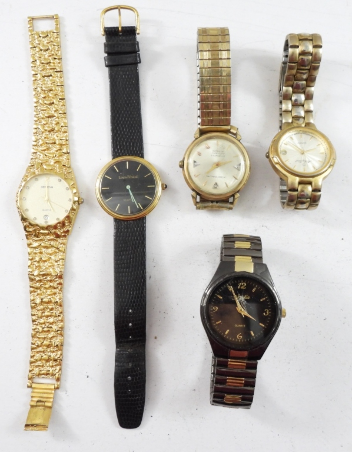 5 MENS FASHIN WATCHES ,3 GOLD TONE ,2 BLACK .NOT TESTED AS TO WORKING OR NOT