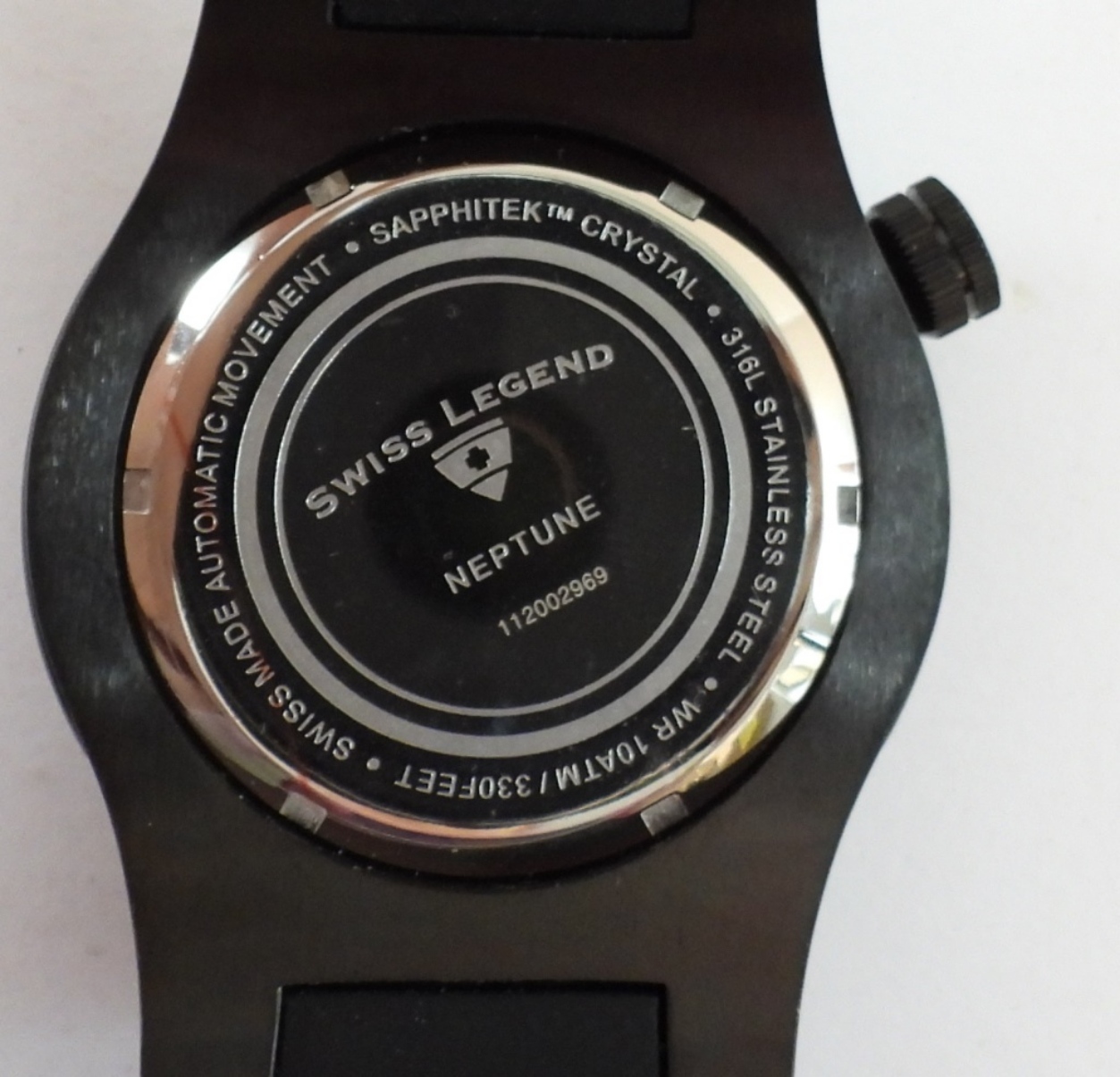SWISS LEGEND, NEPTUNE, MEN’S WATCH. SOFT BLACK RUBBER BAND. #112002969 WR 10ATM/330FEET. AUTOMATIC. (CURRENTLY WORKING BUT NOT TESTED)