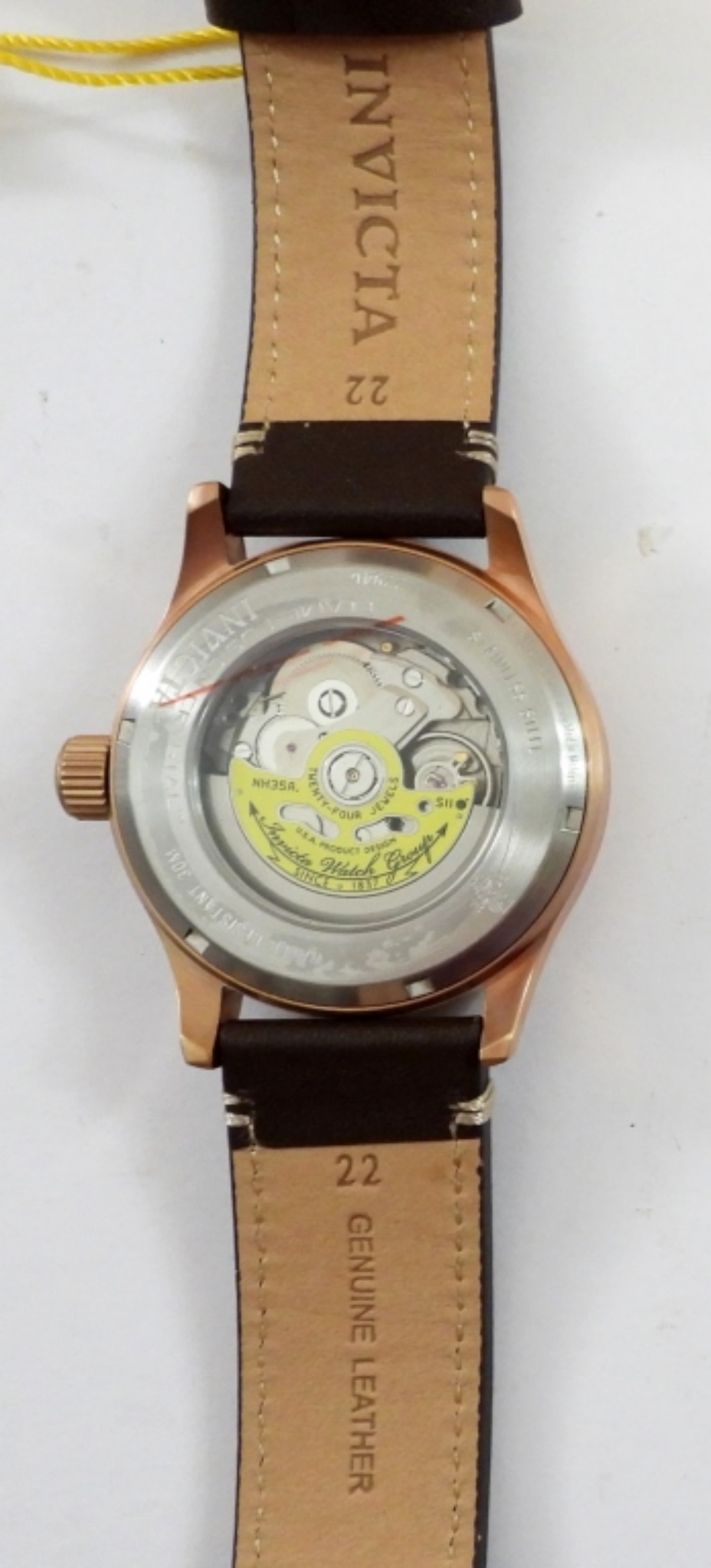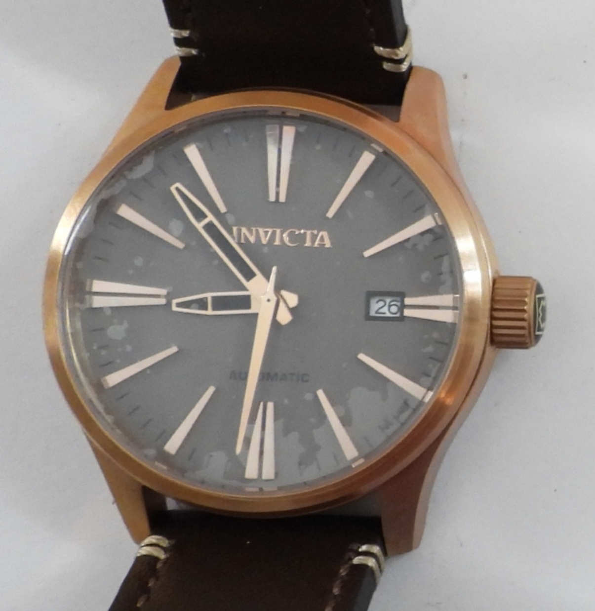 INVICTA AUTOMATIC MEN’S WATCH. ROSE GOLD TONE FACE WITH A RICH BROWN LEATHER BAND. #22946 WATER RESISTANT 30M. (CURRENTLY WORKING BUT NOT TESTED)