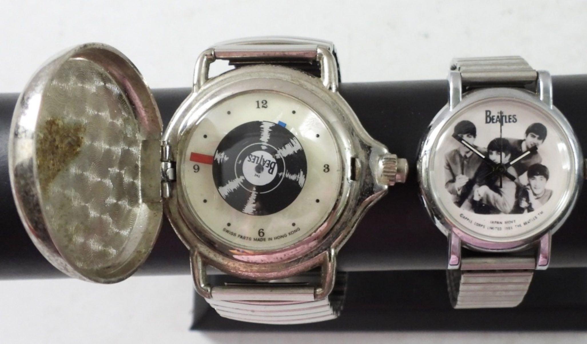 2 VINTAGE 1988 THE BEATLES APPLE CORP WATCHES( I) WITH HIDDEN WATCH, STRETCHY BAND .” NOT TESTED AS TO WORKING OR NOT”