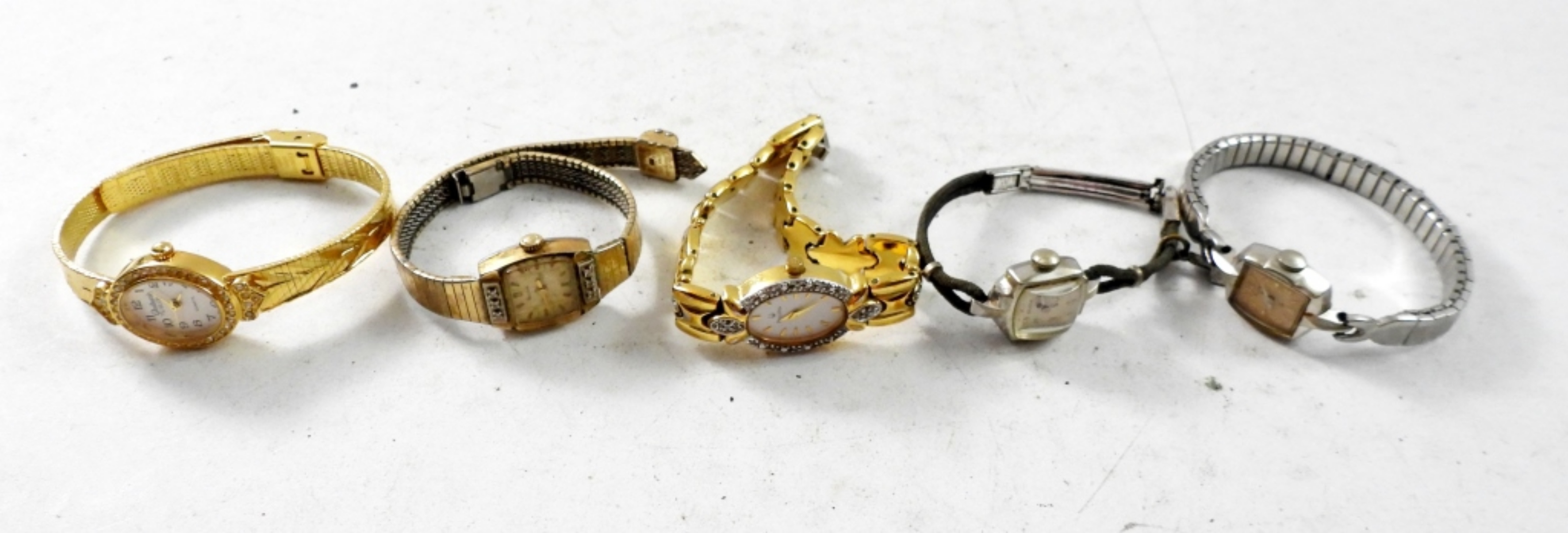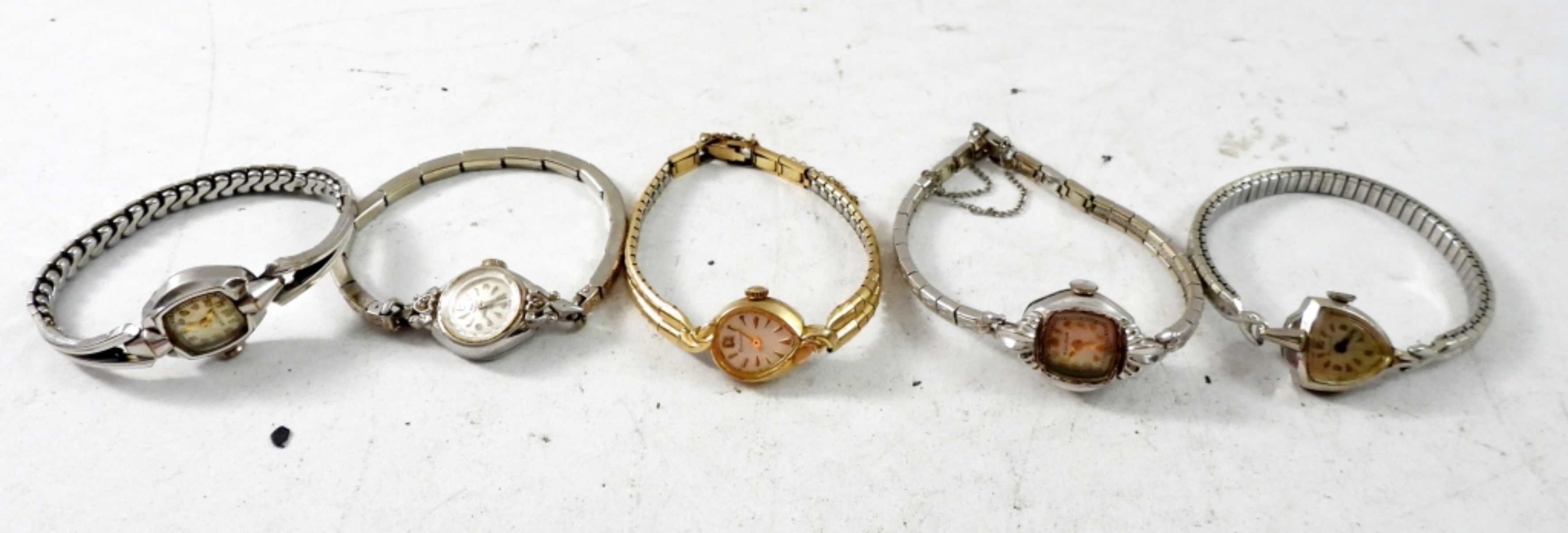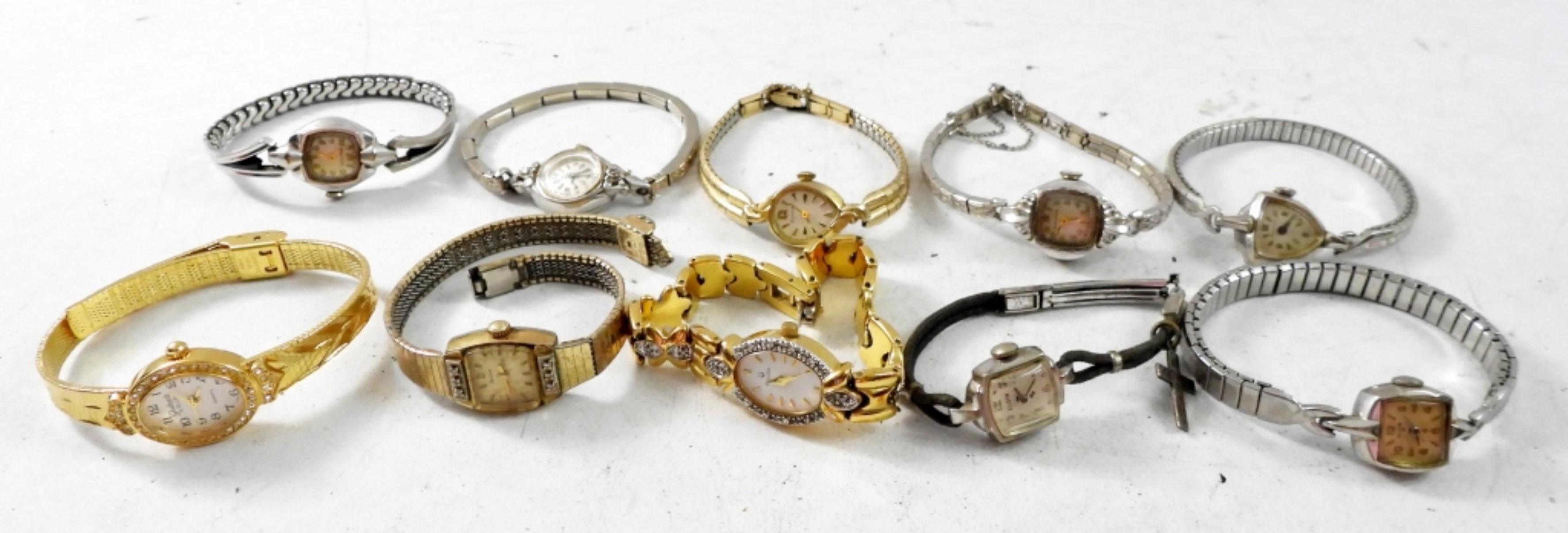 10 VINTAGE SMALL LADIES WATCHES,(3)ELGIN,(6)BULOVA,(1)WALTHAM. GOLD AND SILVER TONE .”NOT TESTED AS TO WORKING OR NOT”
