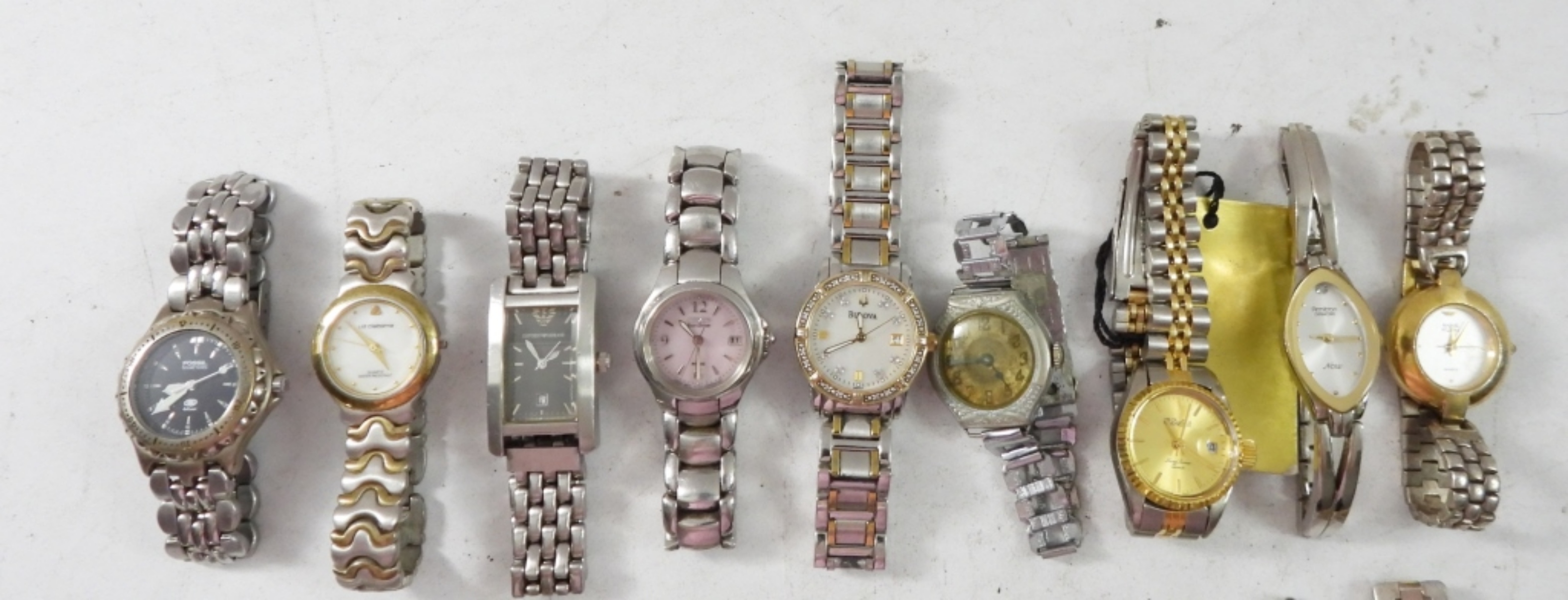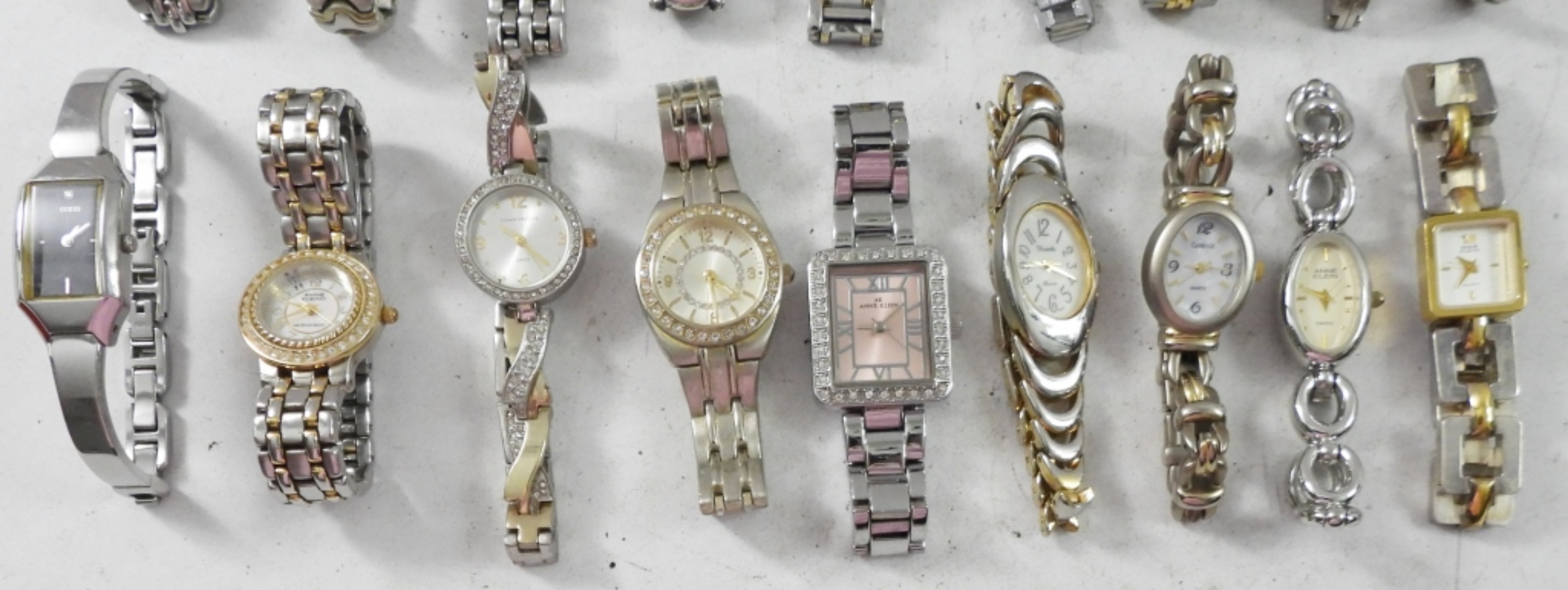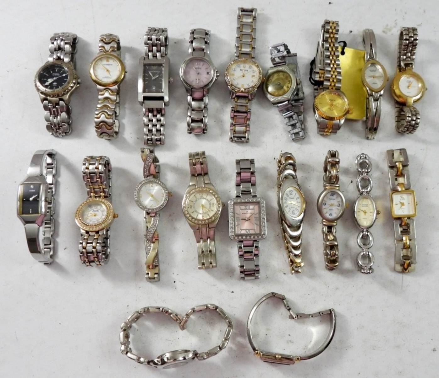 20 FASHIONABLE LADIES WATCHES WITH CLASP BANDS,SILVER & GOLD TONES . NOT TESTED AS TO WORKING OR NOT