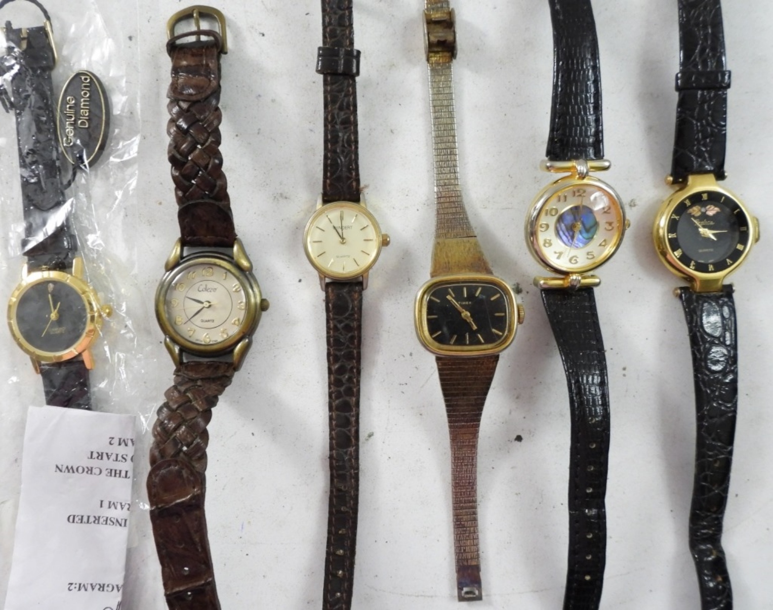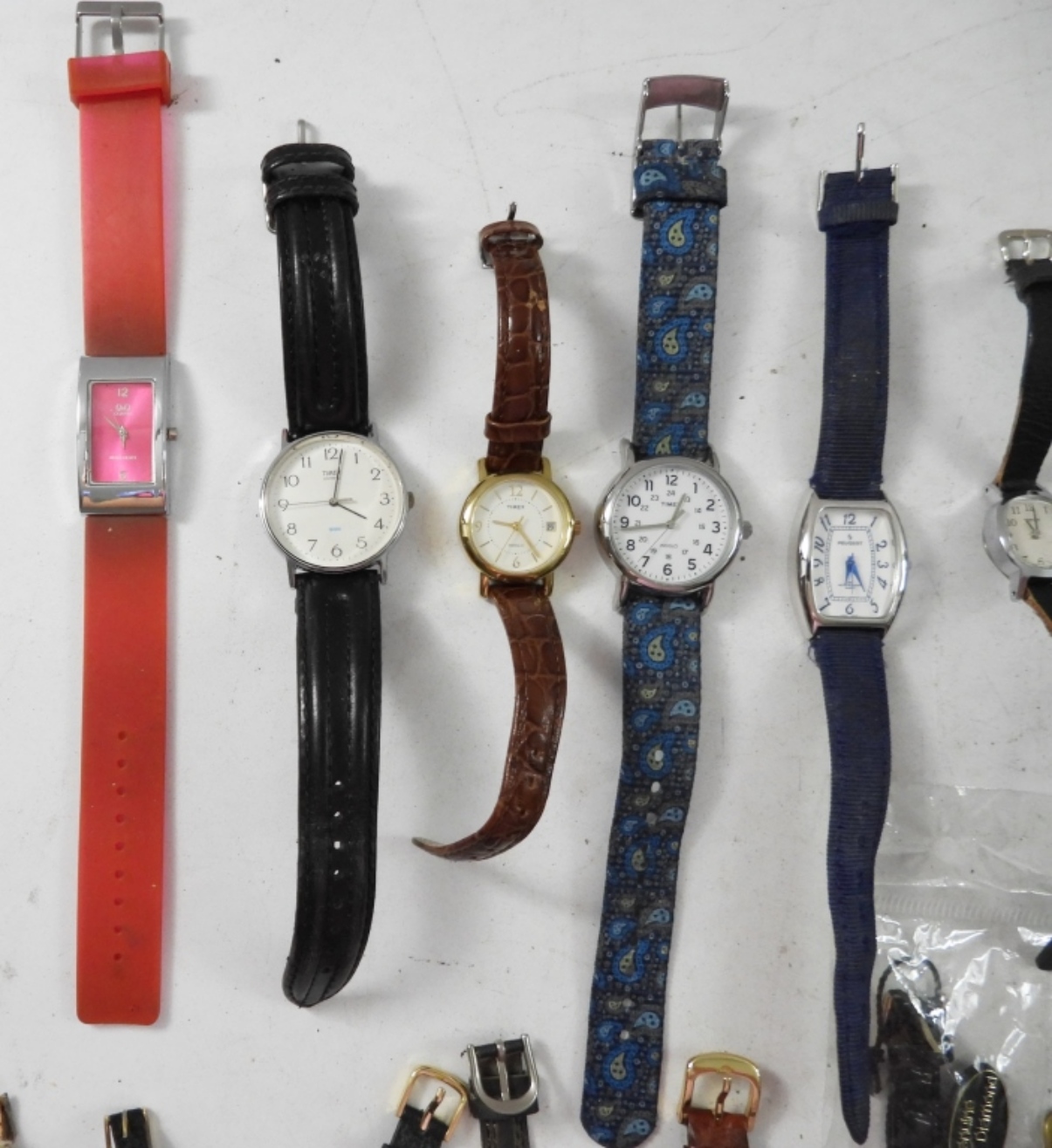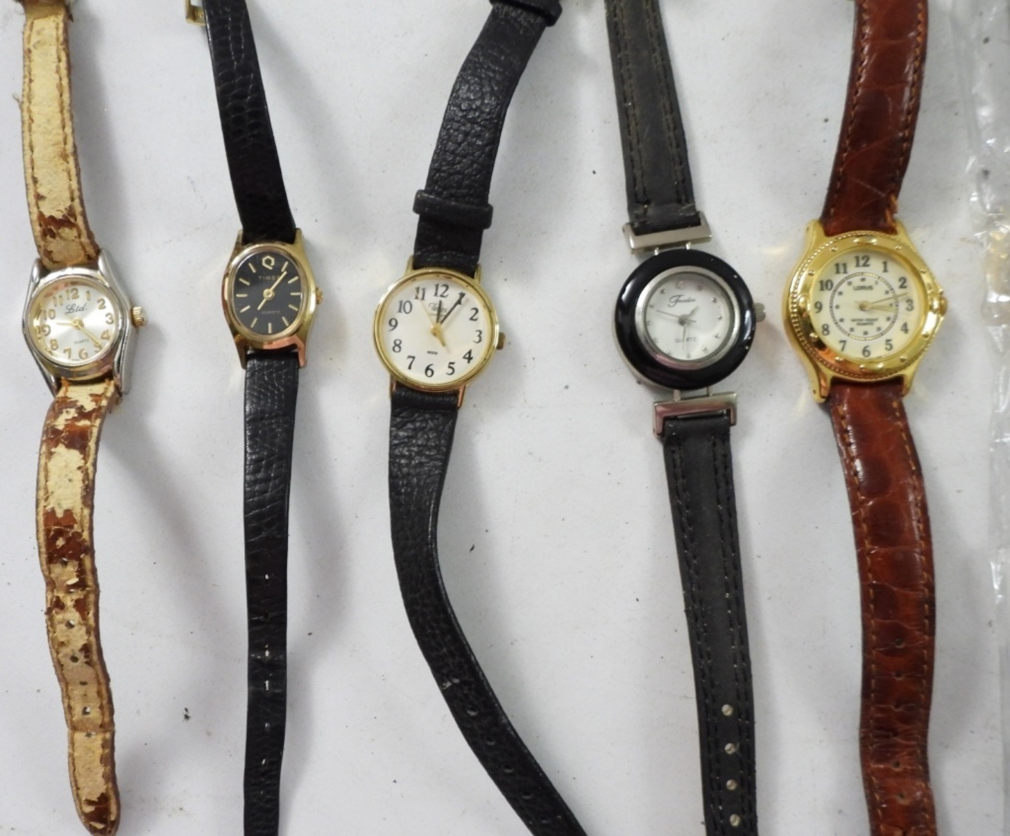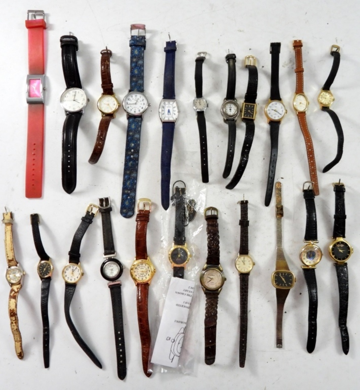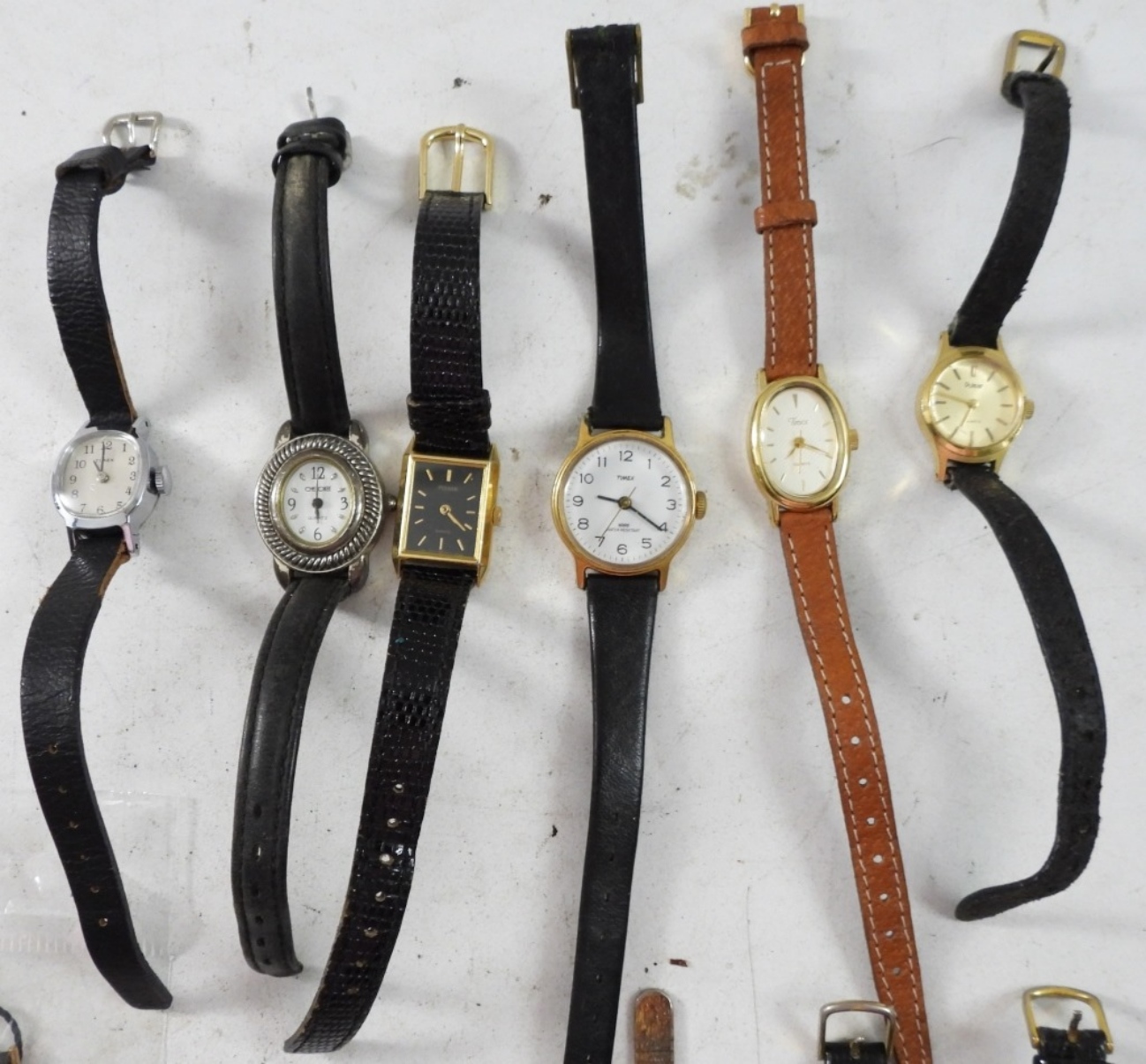 22 TIMEX/ QUARTZ SMALL LADIES WATCHES ,MOST WITH LEAVER BANDS. ASSORTED COLORS. NOT TESTED AS TO WORKING OR NOT