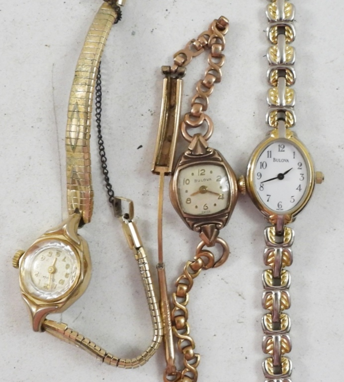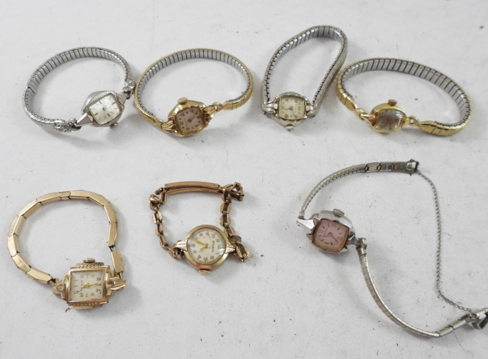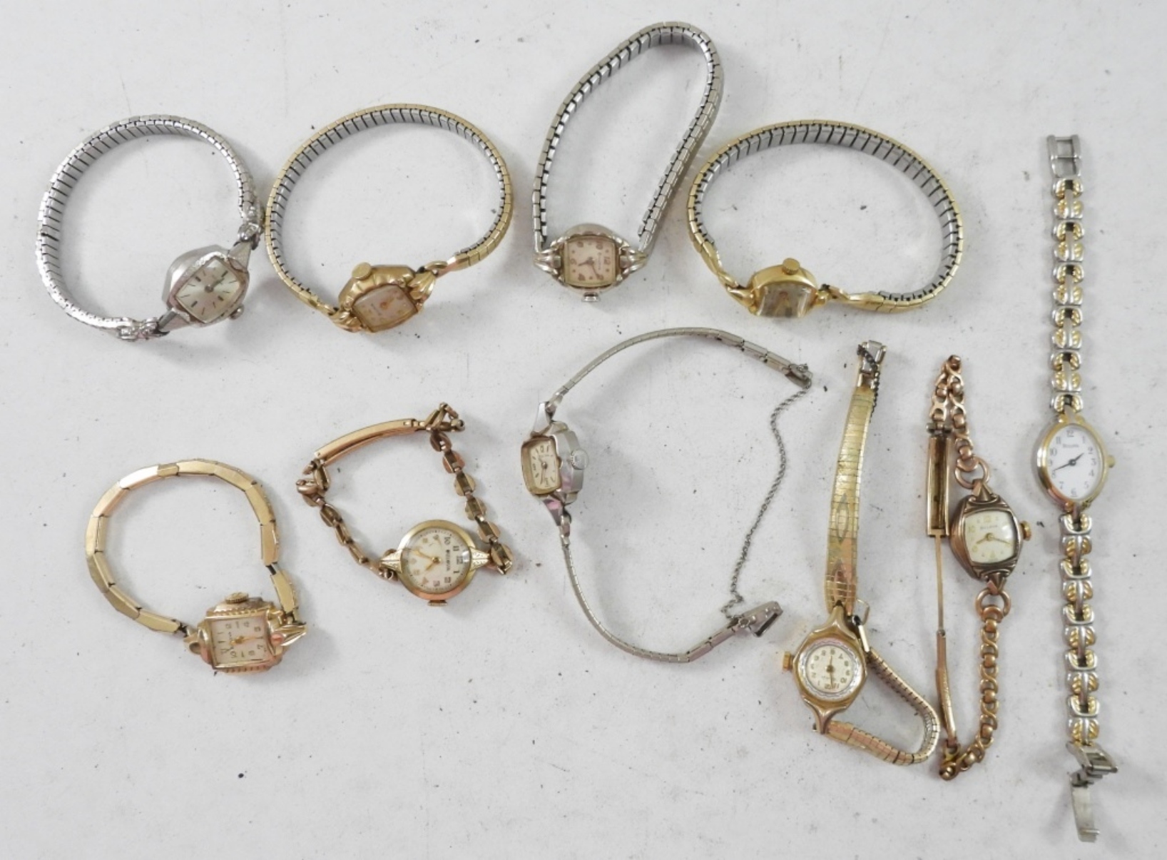 10 SMALL VINTAGE LADIES BULOVA WATCHES, GOLD AND SILVER TONE. NOT TESTED AS TO WORKING OR NOT
