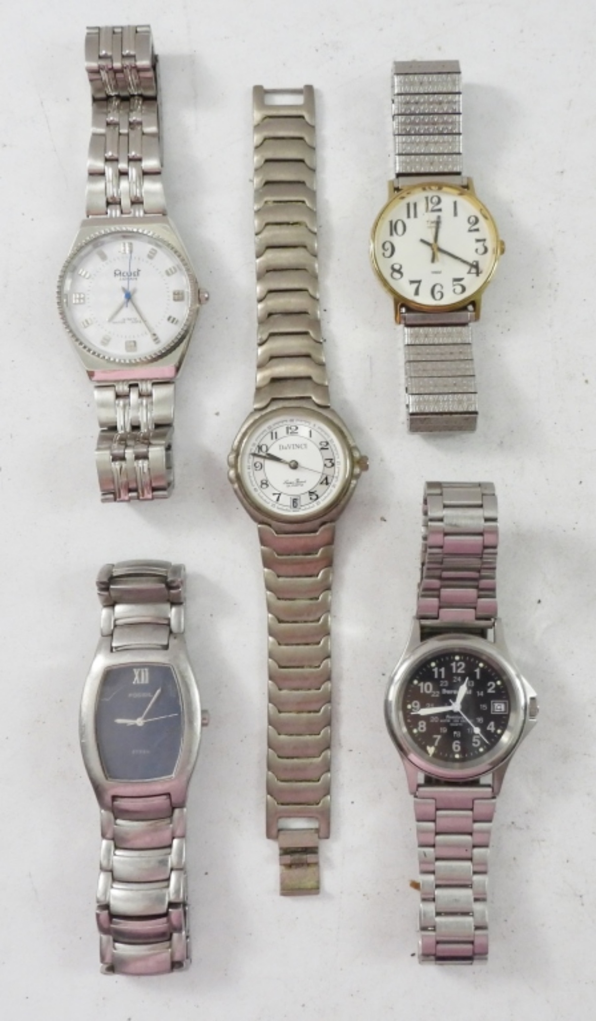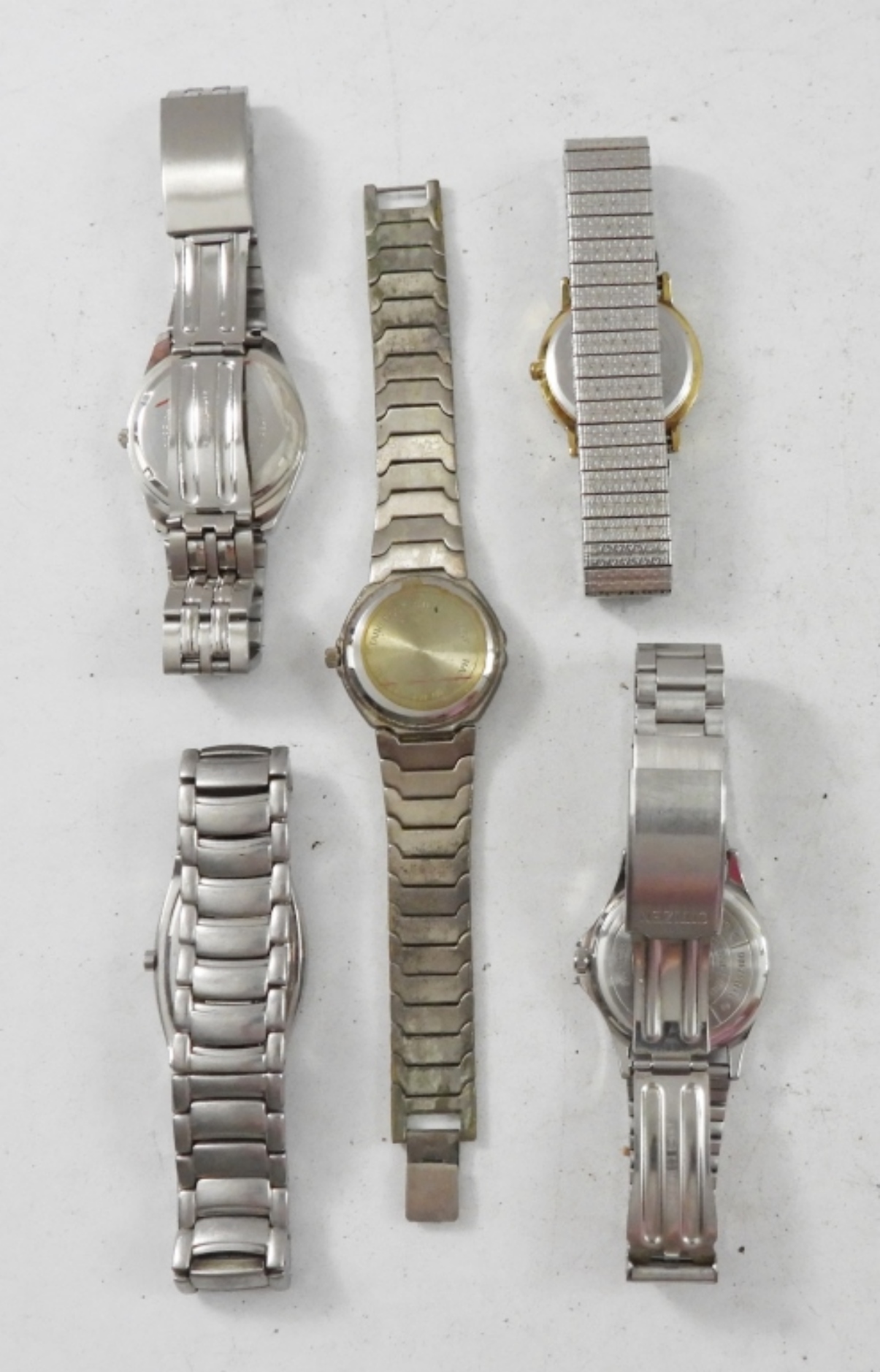 5 MENS SILVER TONE WATCHES ,4 CLASP BANDS 1 STRETCHY. NOT TESTED AS TO WORKING OR NOT