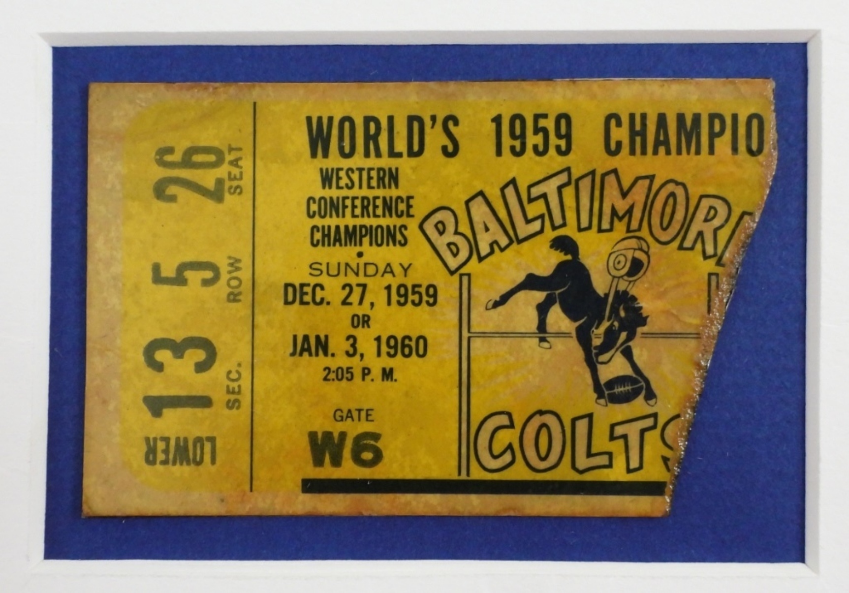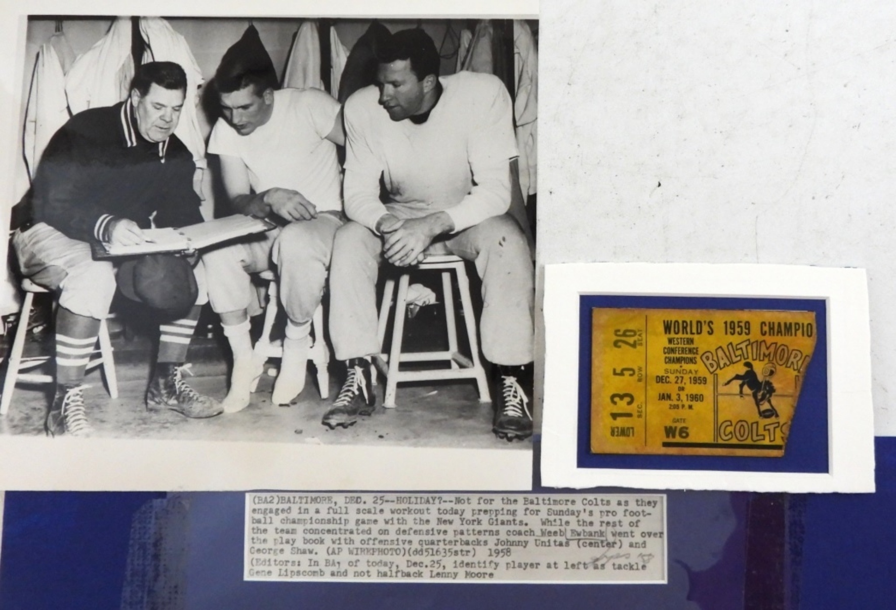 VINTAGE BALTIMORE COLTS MEMORABILIA,1959 BALTIMORE COLTS CHAMPIONSHIP GAME TICKET.A NEWS ARTICLE & PHOTO OF THE COACH AND 2 PLAYERS