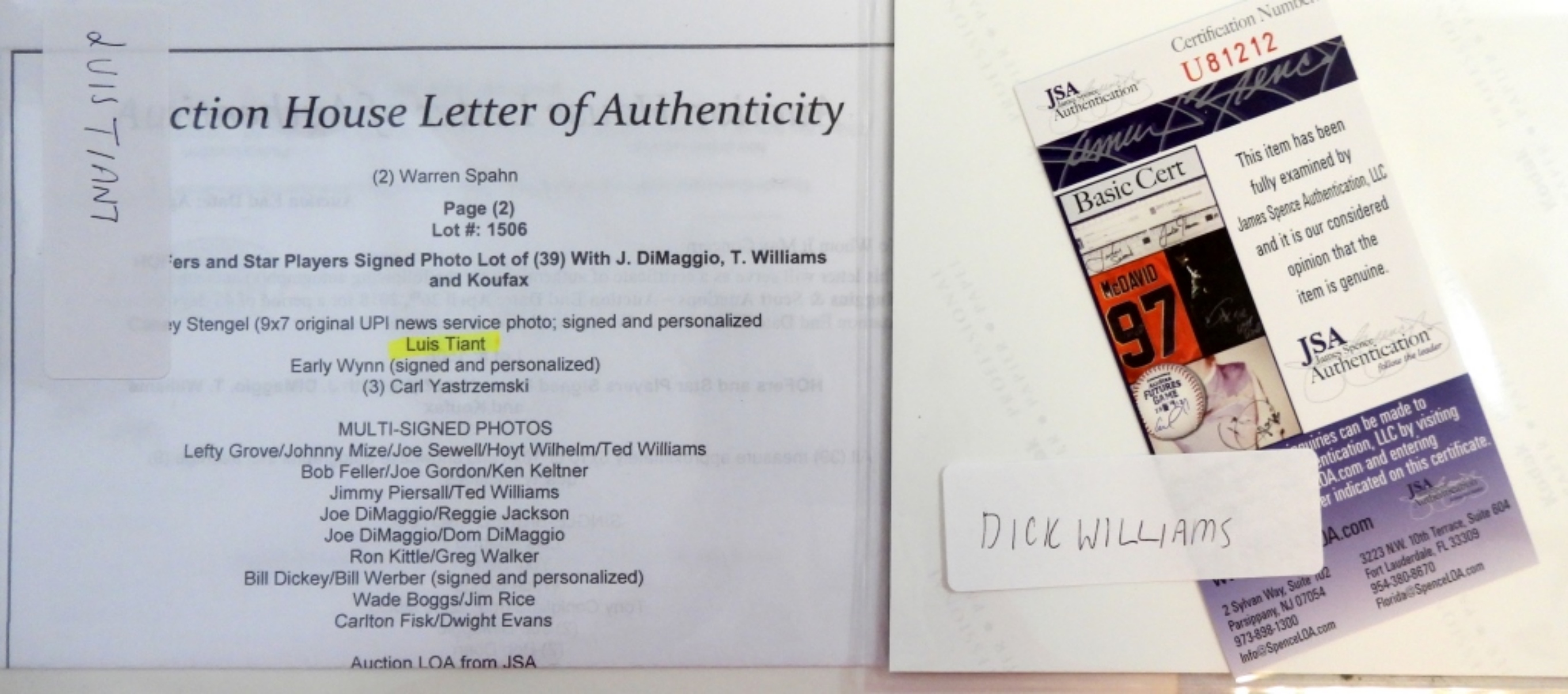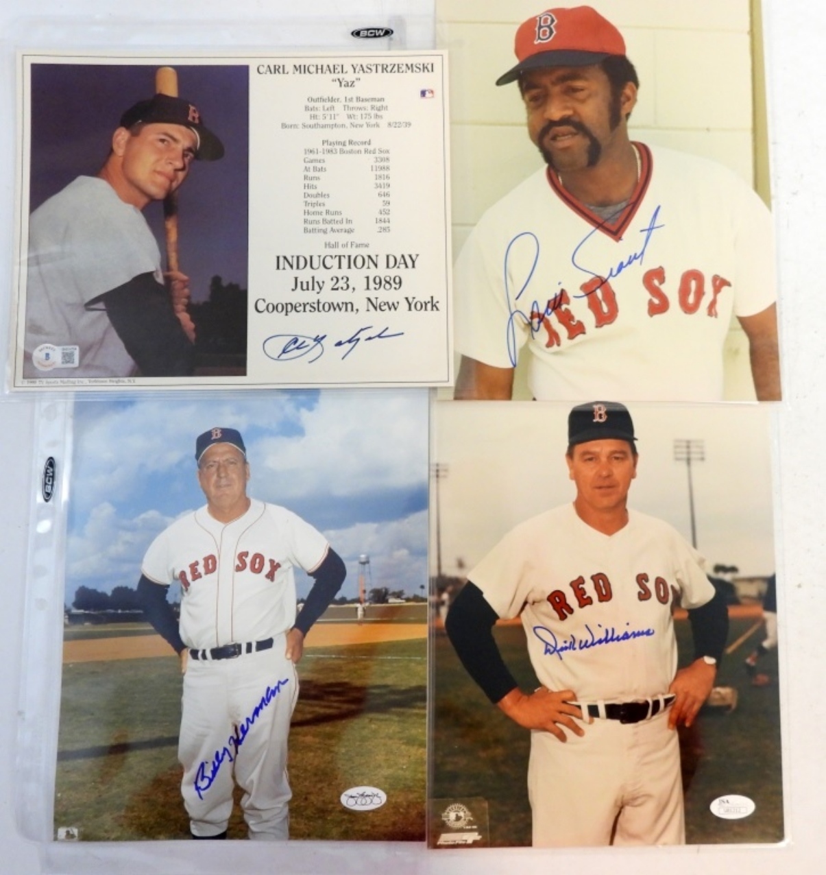 DICK WILLIAMS AUTOGRAPHED 8X10 WITH JSA(U81212), LUIS TIANT AUTOGRAPHED 8X10 WITH AN AUCTION HOUSE LETTER OF AUTHENTICITY ,CARL “YAZ” YASTRZEMSKI SIGNED INDUCTION DAY 1989(NO COA).BILLY HERMANSIGNED 8X10 ( NO COA
