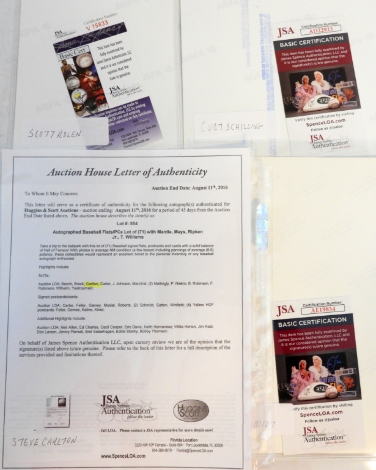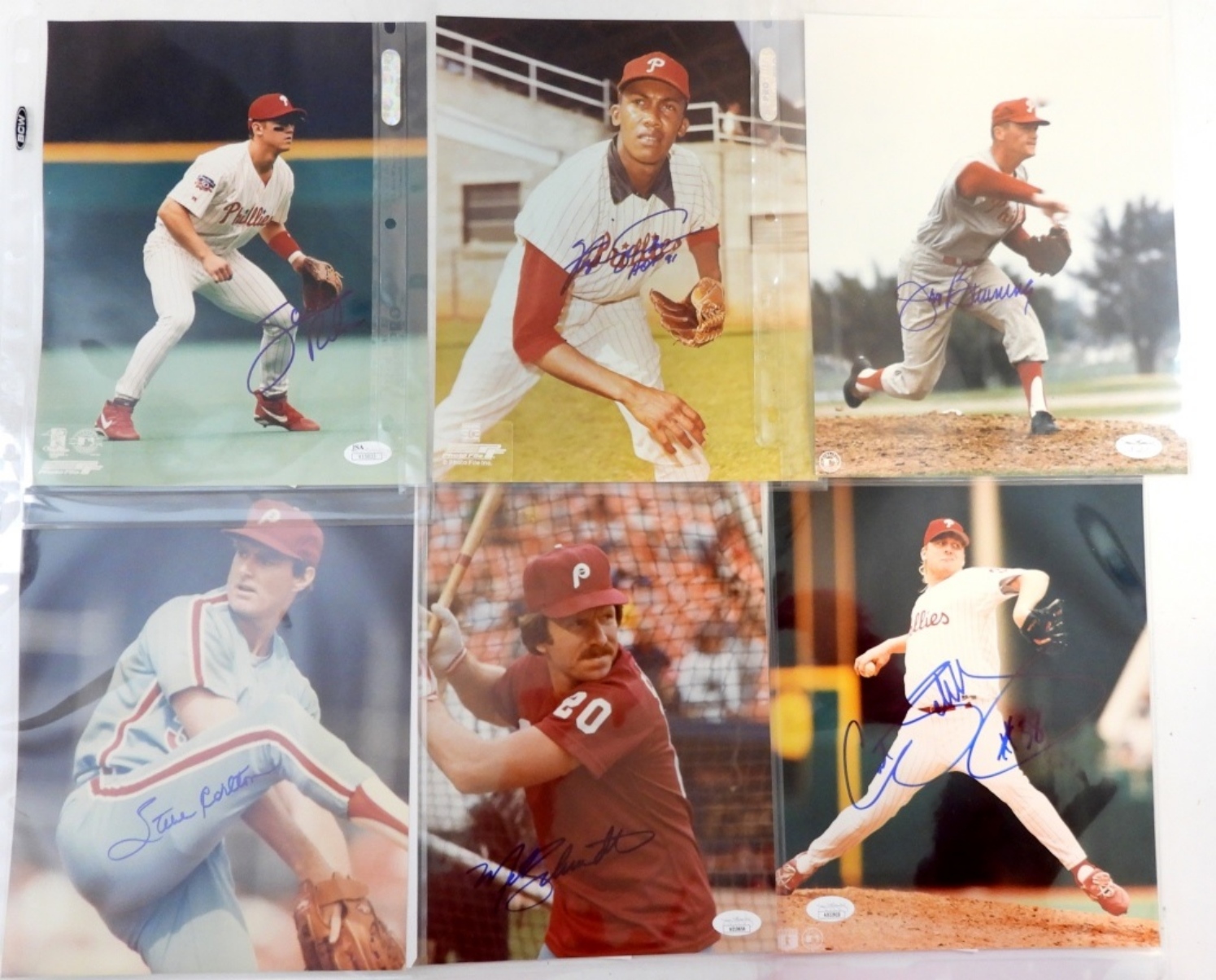 PHILIES SCOTT ROLEN AUTOGRAPHED 8X10 WITH (JSA V15833) , STEVE CARLTON WITH (AUCTION HOUSE LETTER OF AUTHENTICITY). MIKE SCHMIDT WITH ( JSA AE129854).CURT SCHILLING WITH (JSA AD22923). FERGIE JENKINS SIGNED 8X10( NO