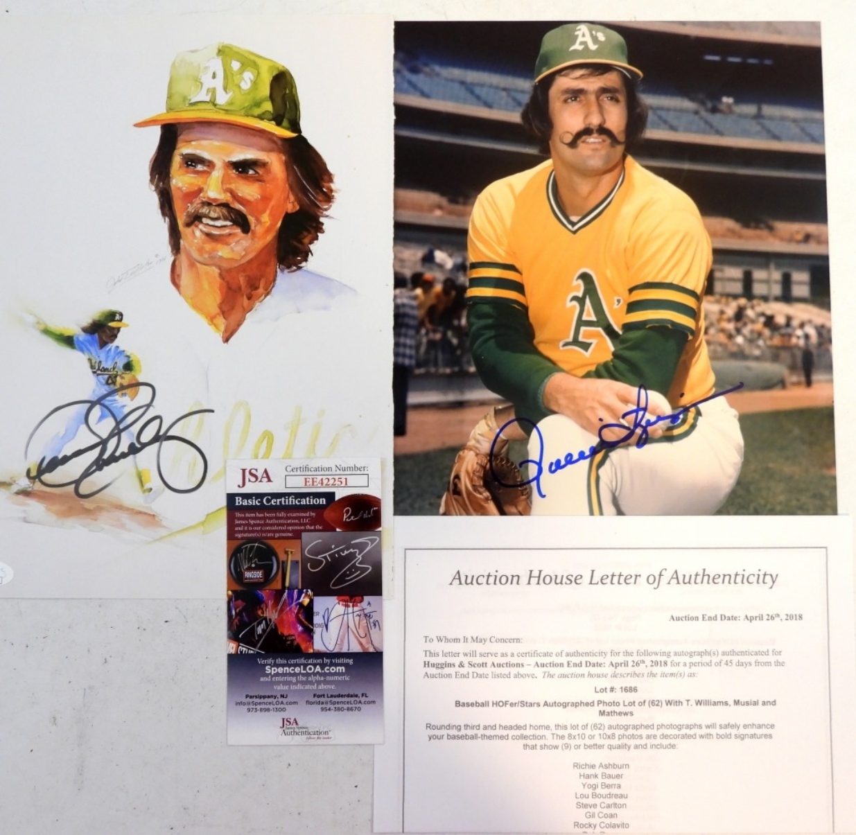 DENNIS ECKERSLEY AUTOGRAPHED 8X10 WITH JSA(EE42251).ROLLIE FINGERS SIGNED 8X 10 WITH AUCTION HOUSE LETTER OF AUTHENTICITY