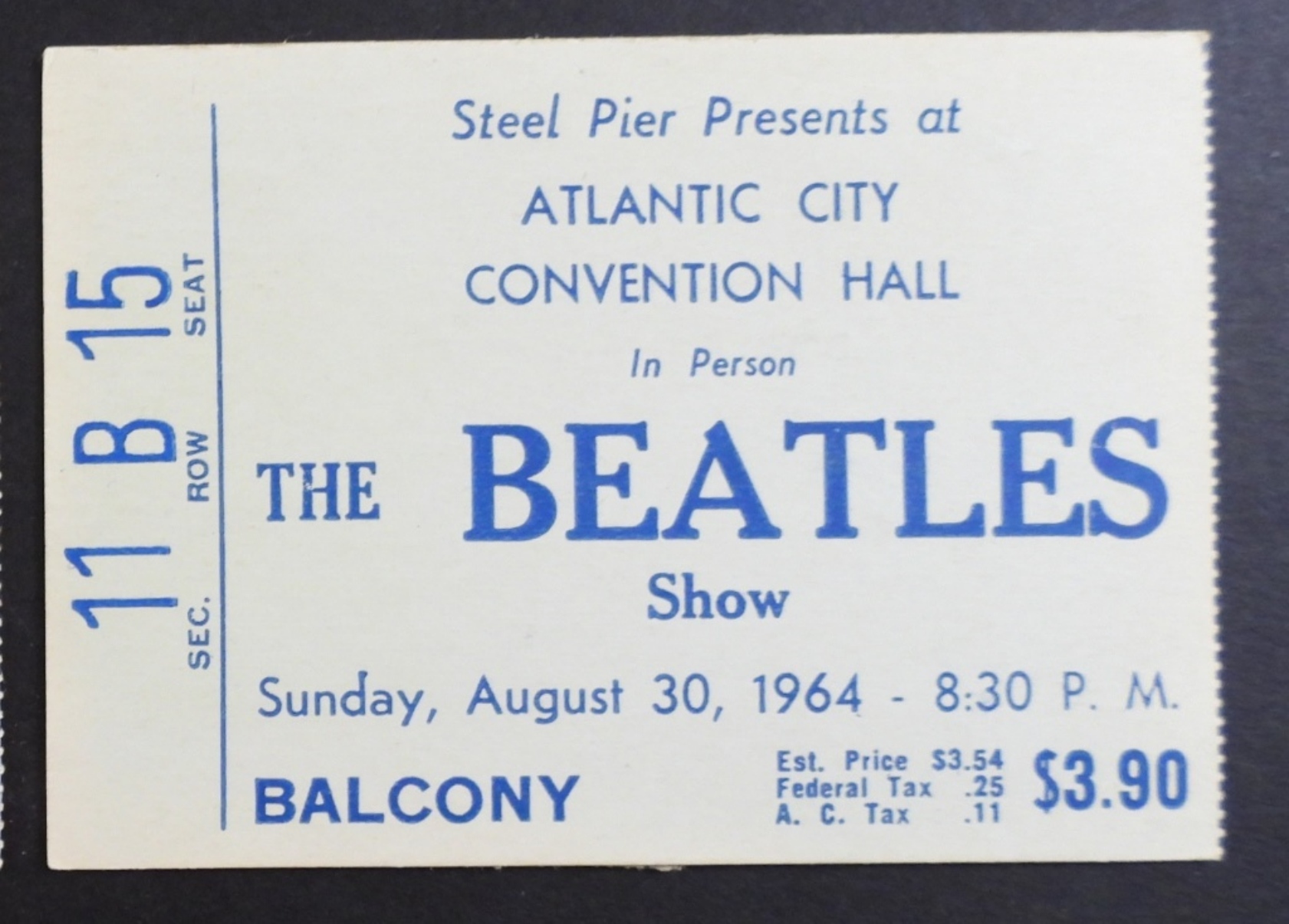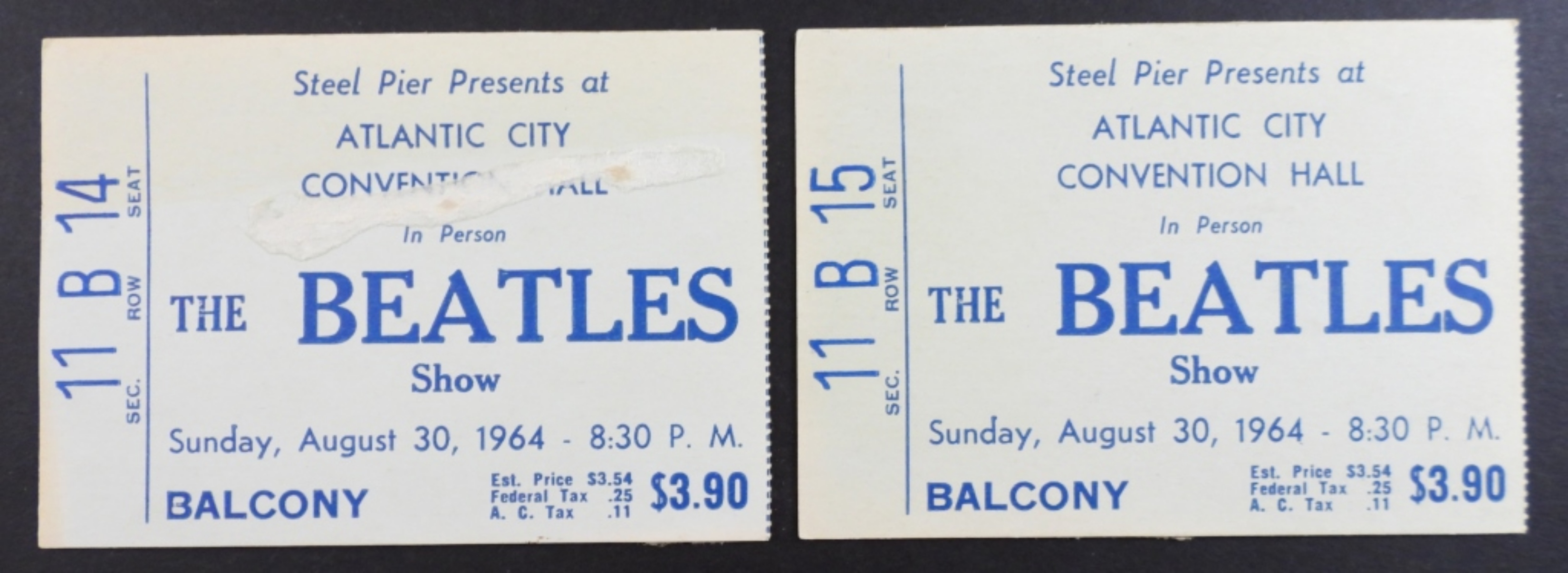 ATLANTIC CITY CONVENTION HALL “THE BEATLES SHOW” BALCONY $3.90 – BOTH HAVE GLUE & PAPER RESIDUE on REV (1) HAS GLUE & PAPER RESIDUE on FRONT ACROSS “CONVENTION HALL” otherwise NICE ORIGINAL CONDITION