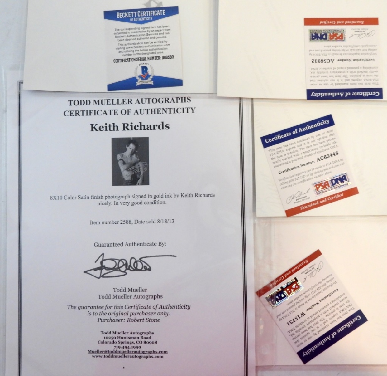 CLIFF WILLIAMS OF AD/DC-PSA/DNA #AC63448. ROB HALFORD OF JUDAS PRIEST-PSA/DNA #AC56932. SAMMY HAGAR OF VAN HALEN-BECKETT# D86583. ROBIN ZANDER OF CHEAP TRICK-PSA/DNA# W15731. KEITH RICHARDS-TODDMUELLER AUTOGRAPHS CERT OF