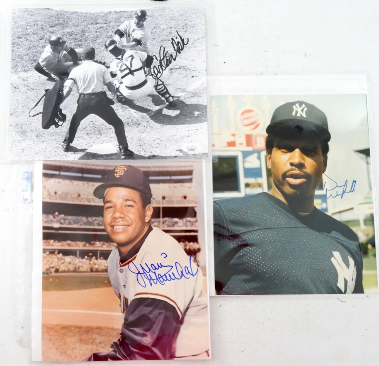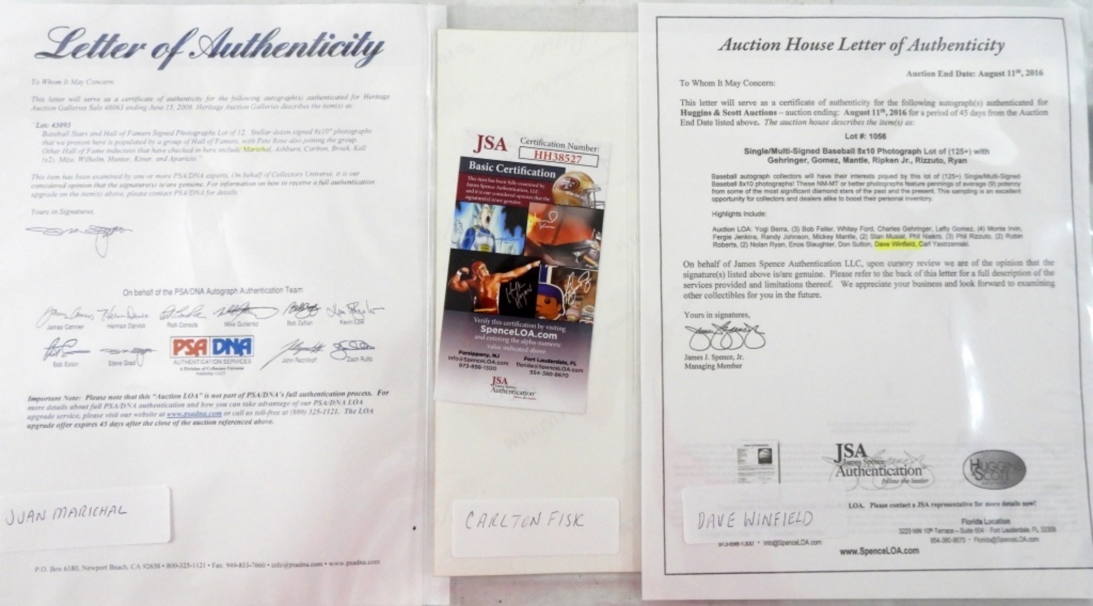 SAN FRANCISCO GIANTS JUAN MARICHAL SIGNED 8X10 WITH LETTER OF AUTHENTICITY FROM PSA/DNA.NY YANKEE DAVE WINFIELD SIGNED 8X10 WITH AUCTION HOUSE LETTER OF AUTHENTICITY FROM JSA.CARLTON FISK SIGNED 8X10 WITH