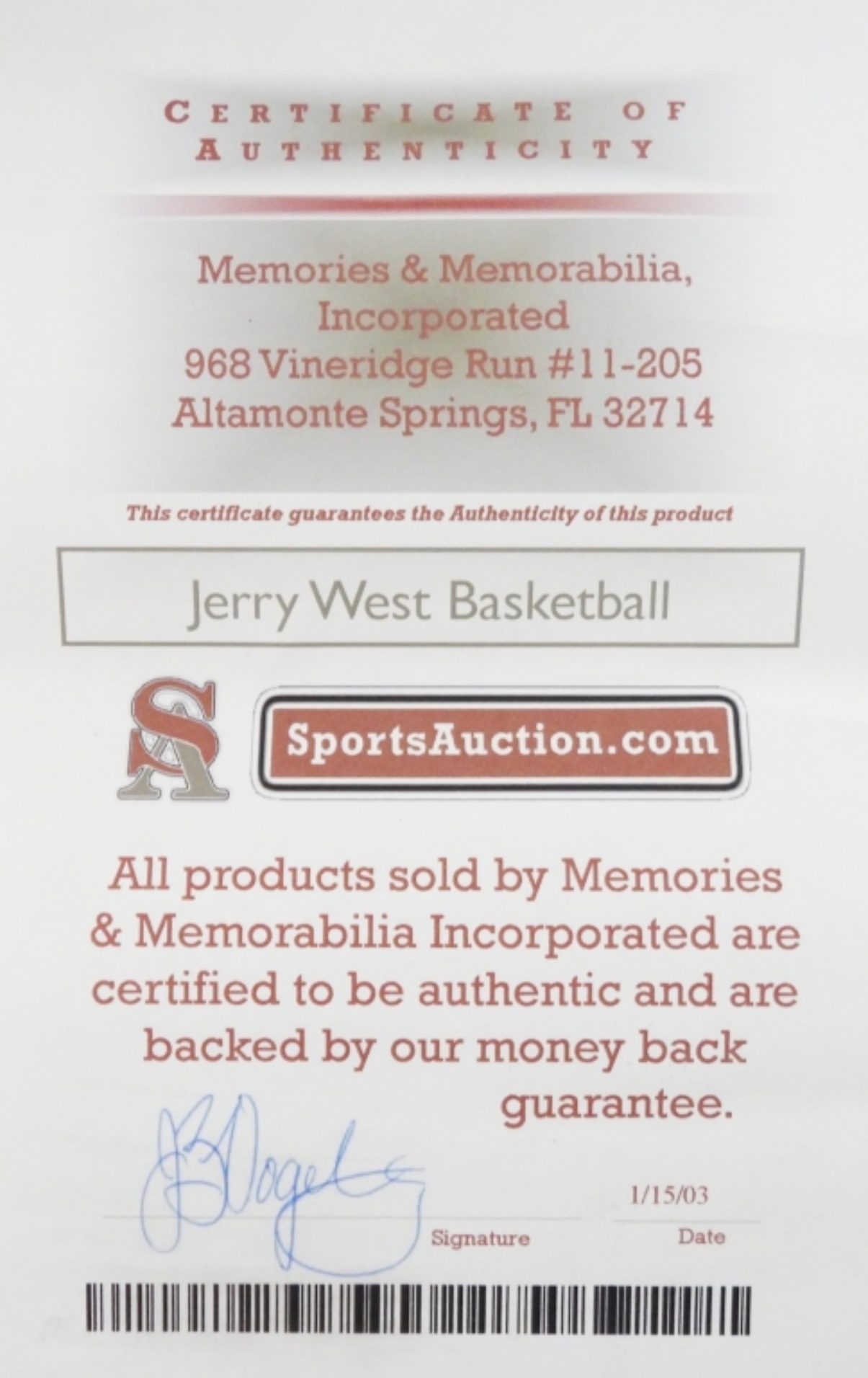 SPALDING NBA FULL SIZE BASKETBALL SIGNED by JERRY WEST – COA by SPORTSAUCTION.COM