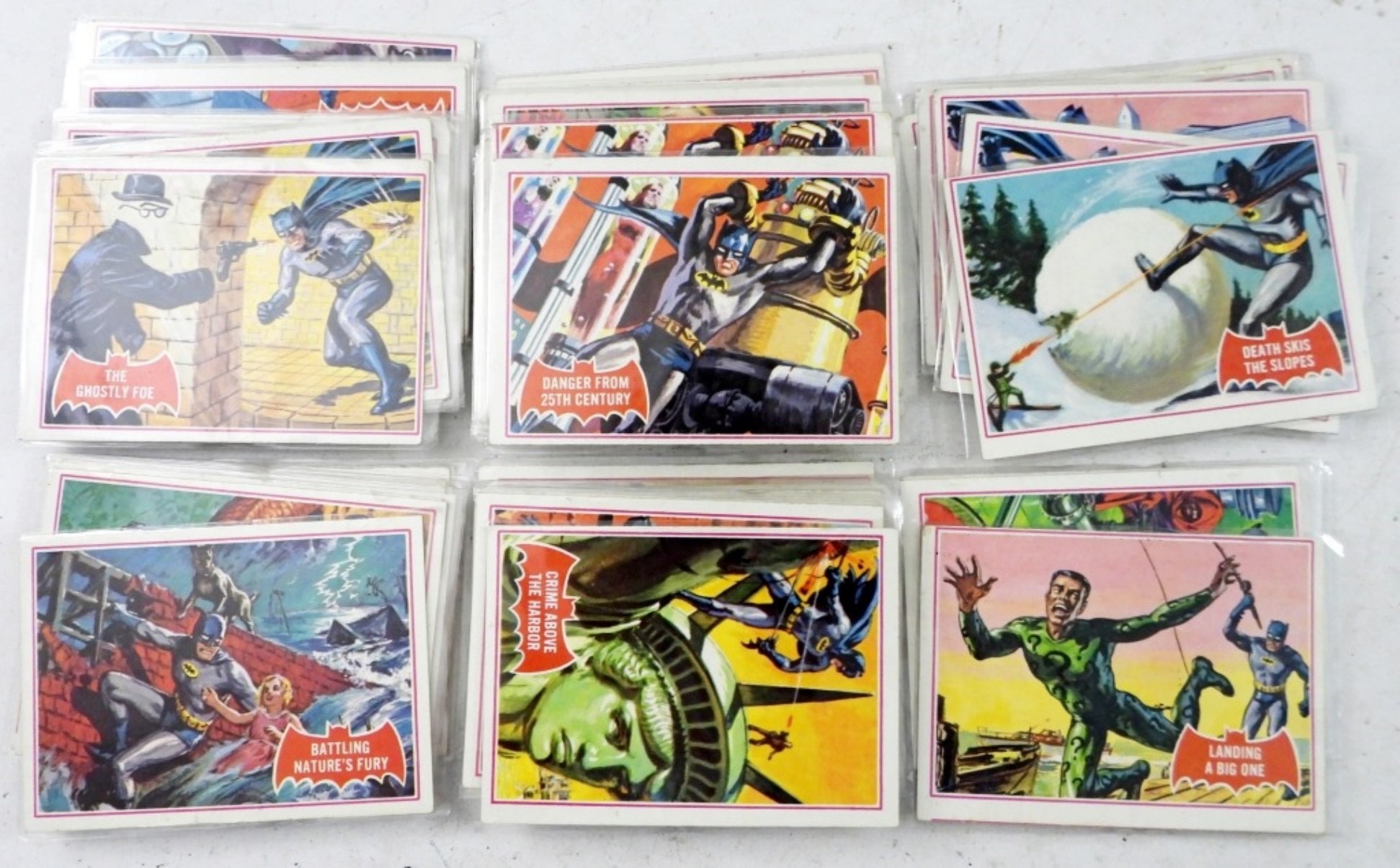 (60) NATIONAL PERIODICAL PUBLICATIONS 1966 BATMAN PUZZLE BACKS TRADING CARDS. BATMAN, PENGUIN, JOKER, ROBIN, CAT WOMAN, RIDDLER. NOT ALL ARE FULL SETS. THERE ARE DUPLICATES.