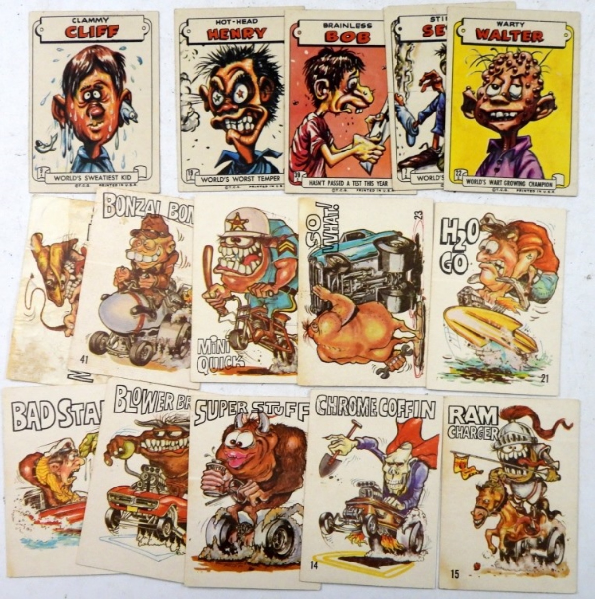 15 LATE 1960’S TOPPS SLOB STICKER CARDS AND ODD RODS TRADING STICKER CARDS.