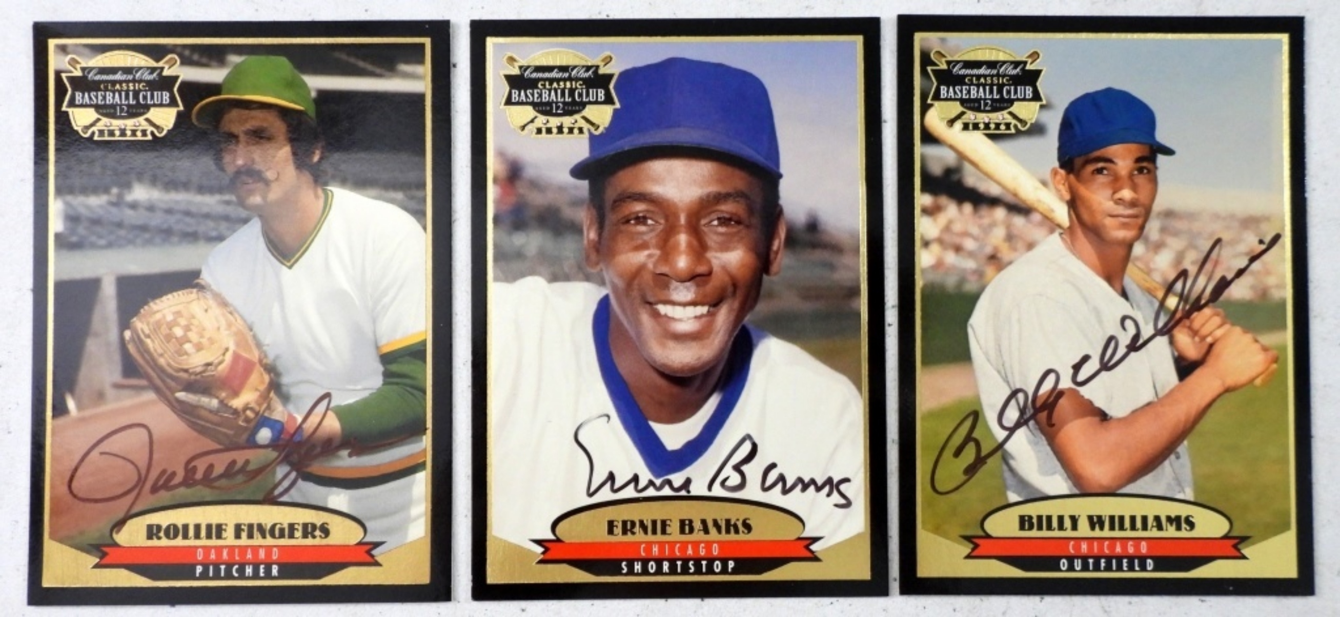 AUTOGRAPHED CANADIAN CLUB CARDS w/COA .ERNIE BANKS ,BILLY WILLIAMS &ROLLIE FINGERS WITH COA BY CANADIAN CLUB (EX)
