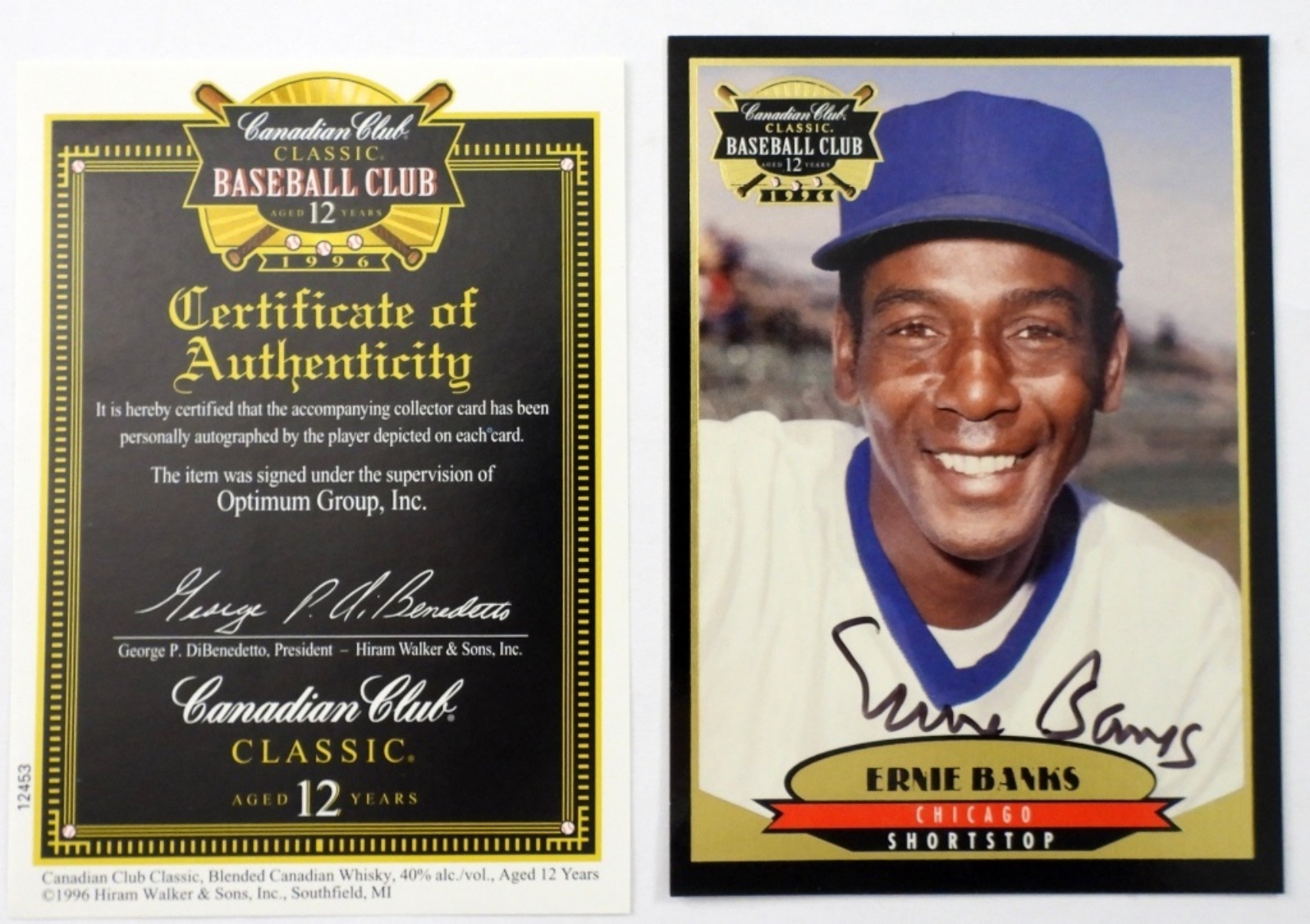 ERNIE BANKS AUTOGRAOHED CLUB CARD WITH COA BY CANADIAN CLUB (EX)