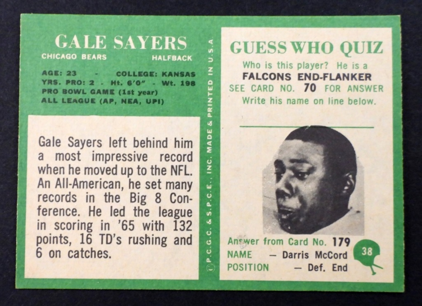 GALE SAYERS CHICAGO BEARS 1966, PHILADEPHIA #38 ROOKIE CARD (EXMT)