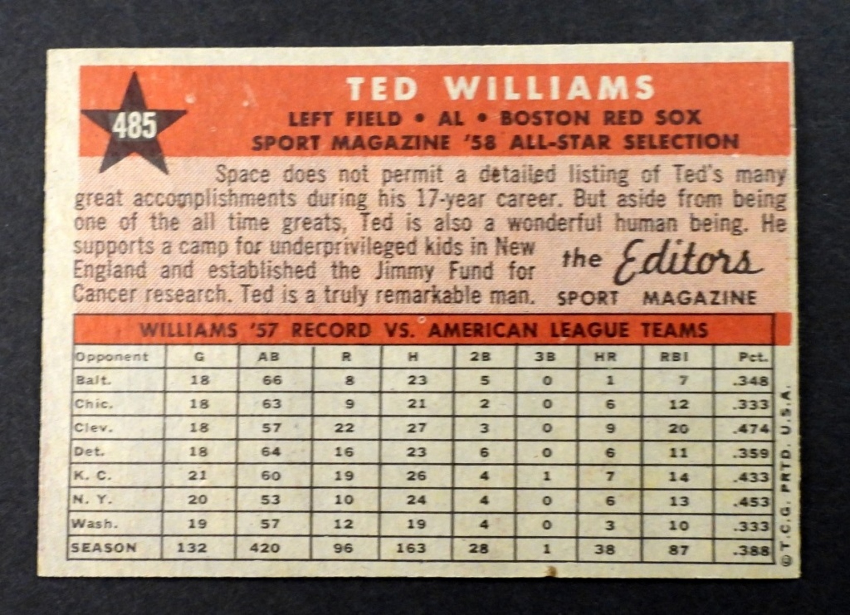 1958 ALL STAR TED WILLIAMS TOPPS#485 (EX) NICE COLOR AND SHINE