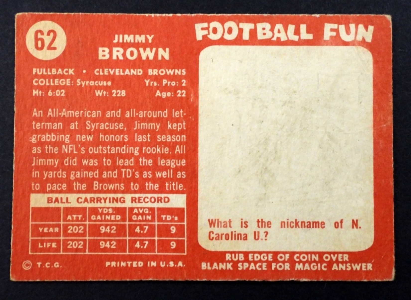 1958 JIMMY BROWN ROOKIE TOPPS#62 (VG/G) BACK HAS BEEN UNRUBBED