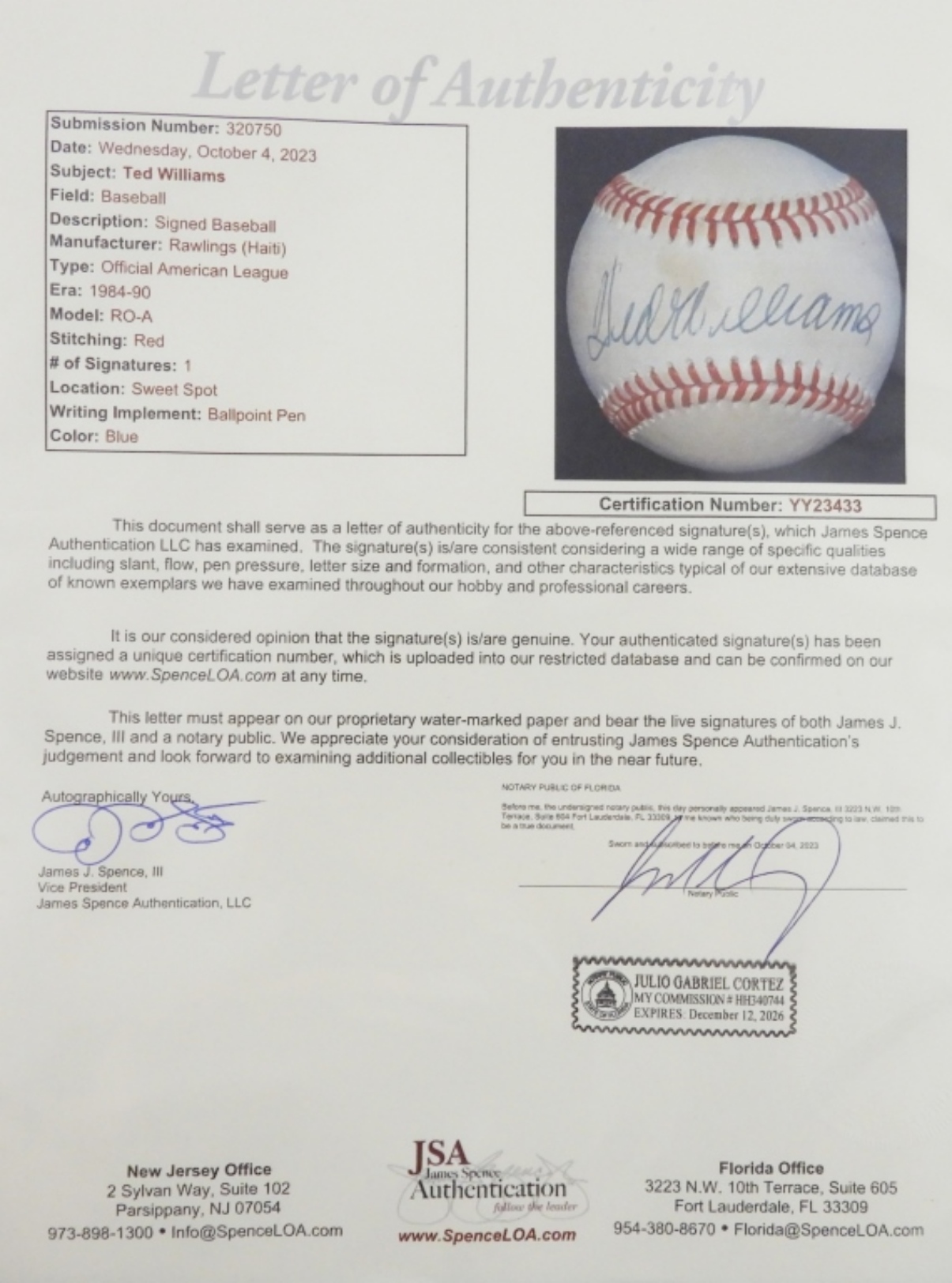 AMERICAN LEAGUE BALL SIGNED by TED WILLIAMS – COA by JSA & CHARLES L SHOUP 6/28/93
