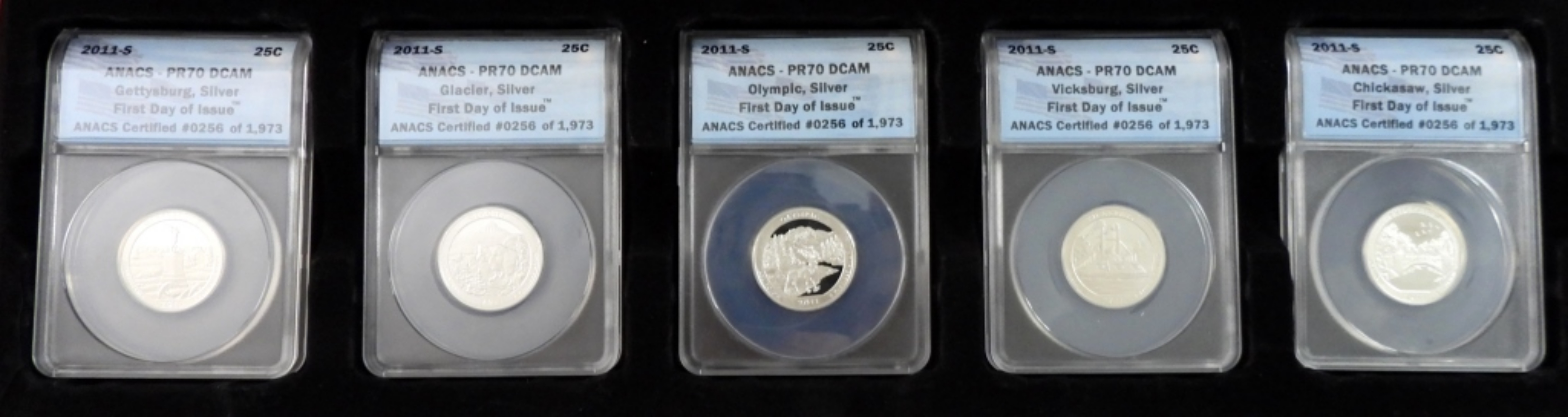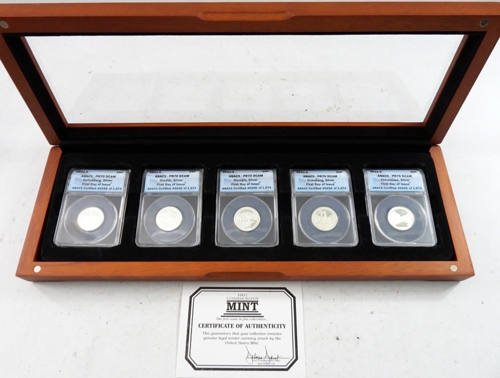 (5) FIRST DAY OF ISSUE SILVER QUARTERS IN WOODEN DISPLAY CASE W/ COA. GETTYSBURG, GLACIER, OLYMPIC, VICKSBURG, & CHICKASAW.