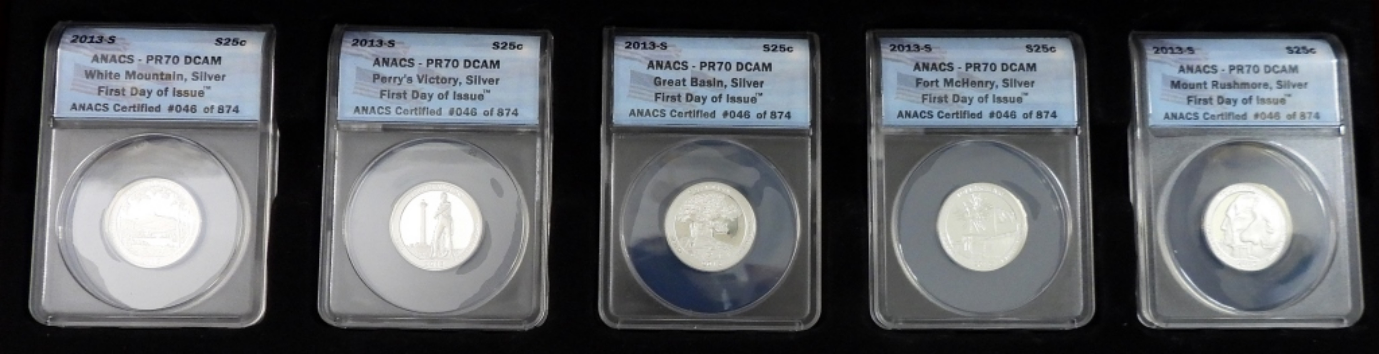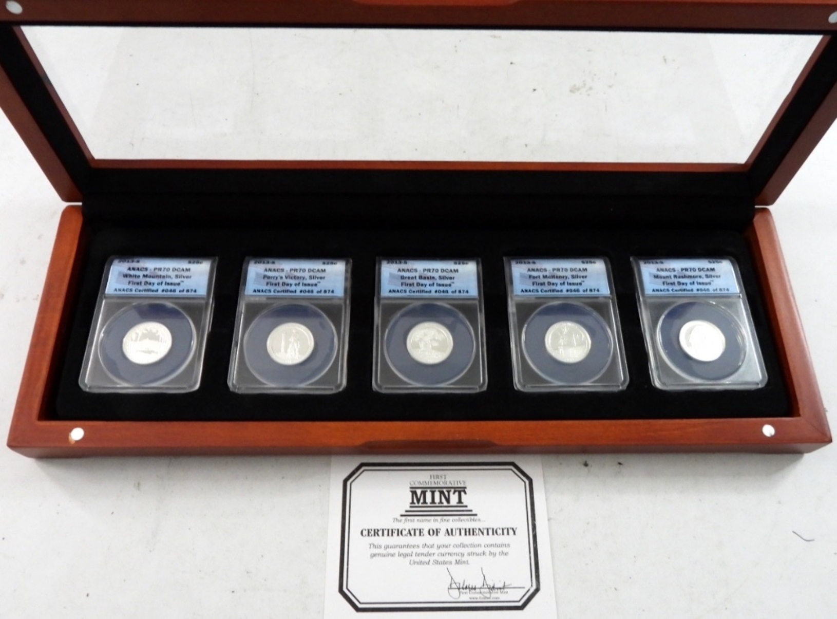 (5) FIRST DAY OF ISSUE SILVER QUARTERS IN WOODEN DISPLAY CASE W/ COA. WHITE MOUNTAIN, PERRY’S VICTORY, GREAT BASIN, FORT McHENRY, & MOUNT RUSHMORE.