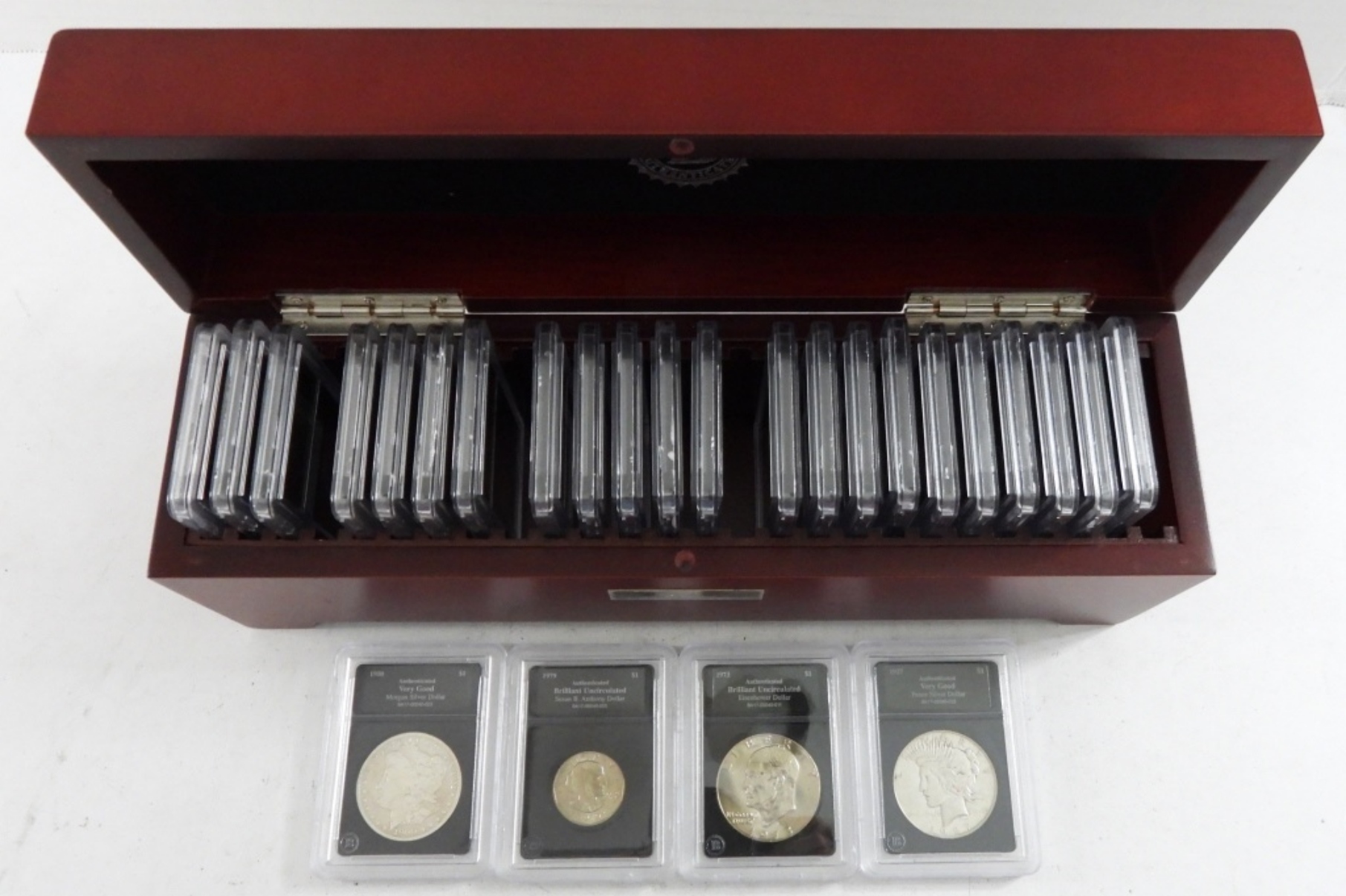 (6) VG MORGANS, (9) VG PEACE, (7) BU IKEs, & (4) BU SBAs. IN DISPLAY BOX. ALL IN BRADFORD SLABS. NO SILVER IKES.