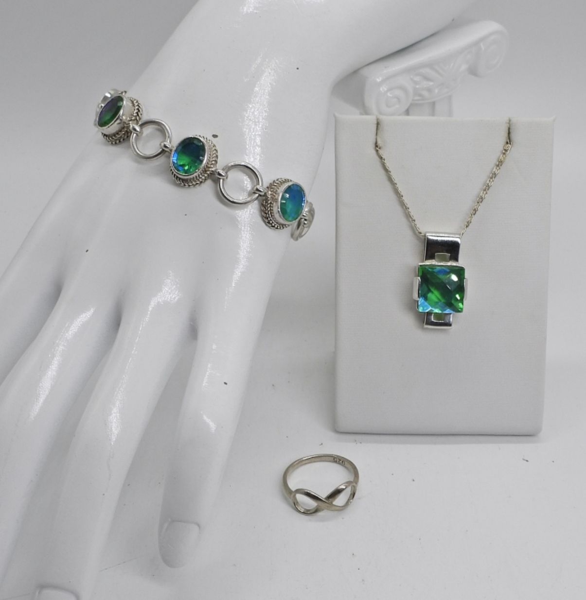 SIESTA KEY WATERCOLOR NECKLACE 19″ AND MATCHING BRACELET 7″. INFINITY STERLING RING SIZE 6 3/4. 21.3 DWT