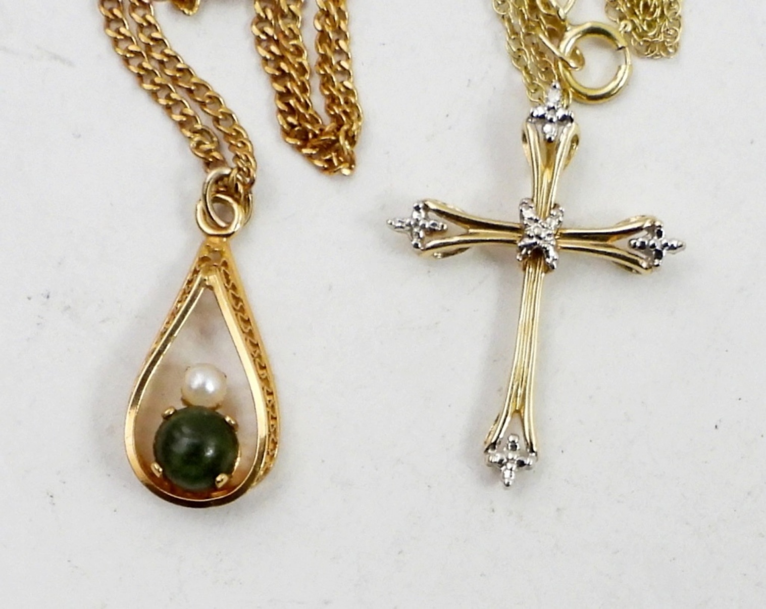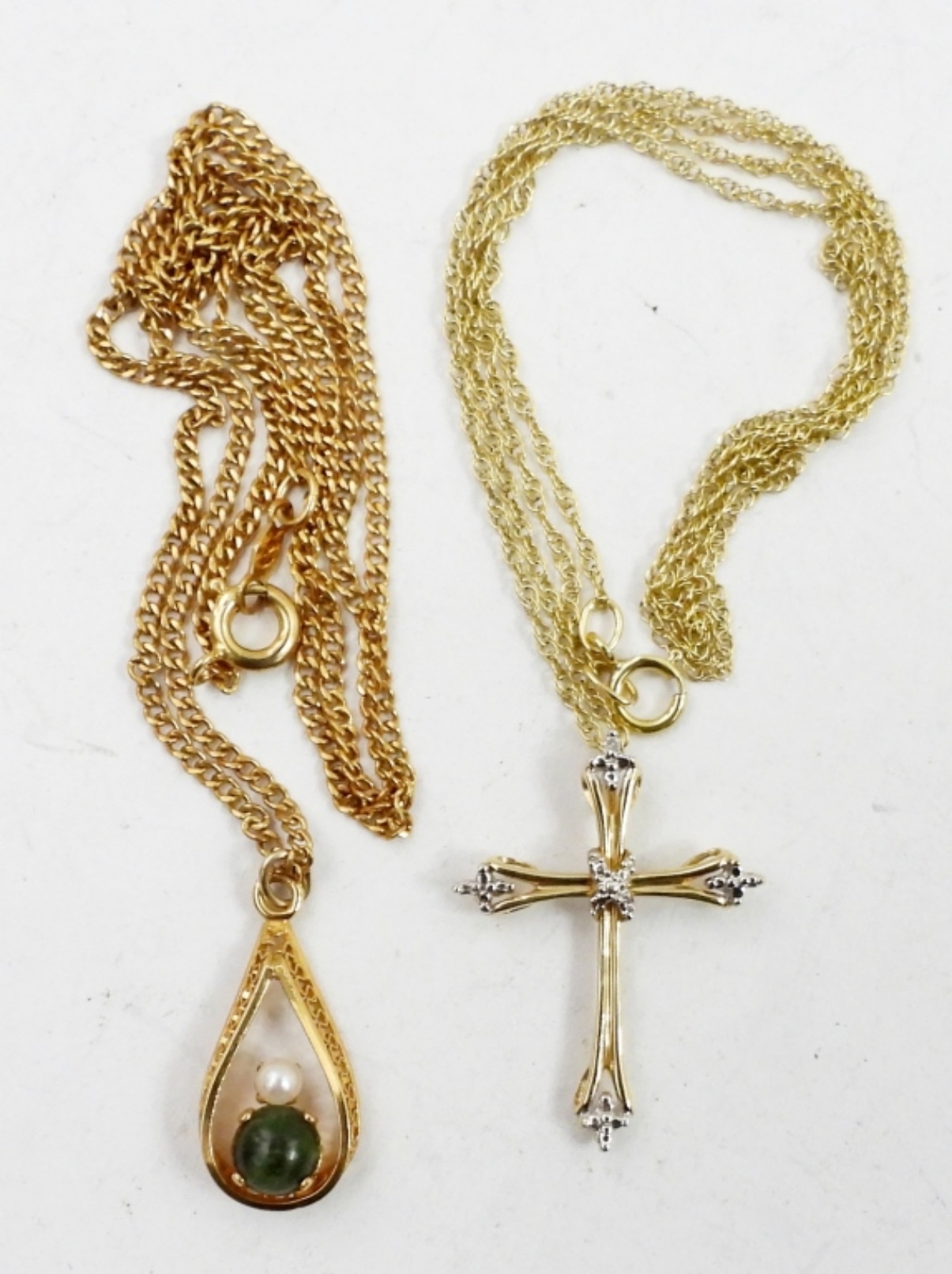 14K GOLD FILLED CROSS PENDANT ON A 14K GOLD FILLED CHAIN, 18″. 12K GOLD FILLED PENDANT WITH TWO GEMSTONES ON A 12K GOLD FILLED CHAIN, 19″. 2.6 DWT