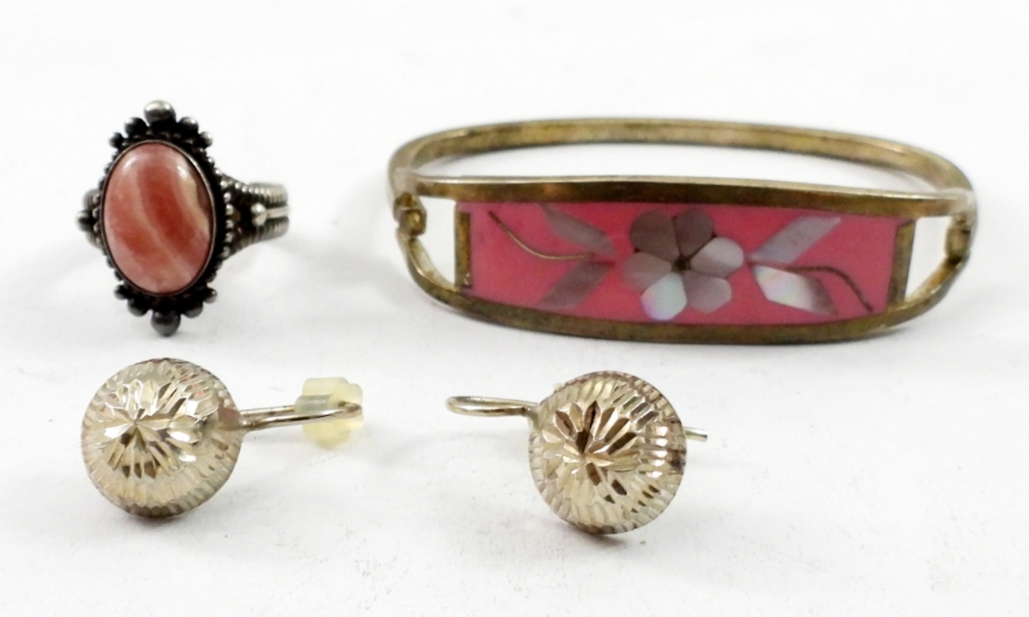 16IN GOLD TONE NECKLACE, GOLD TONE MEXICO HINGED BANGLE WITH PINK INLAY,SIZE 6 RING WITH PINK STONE AND A PAIR OF GOLD TONE EARRINGS. 23.6 DWT