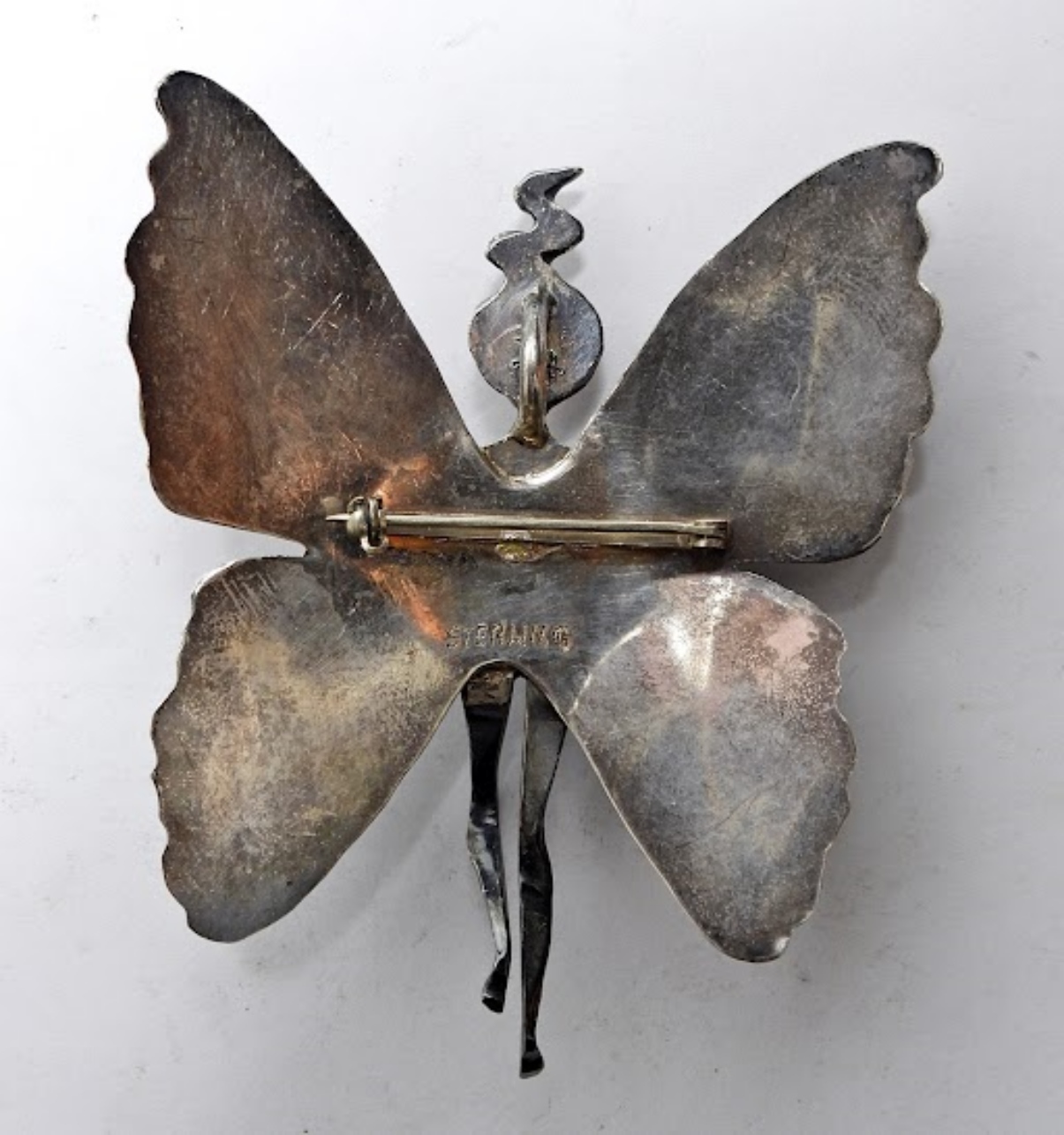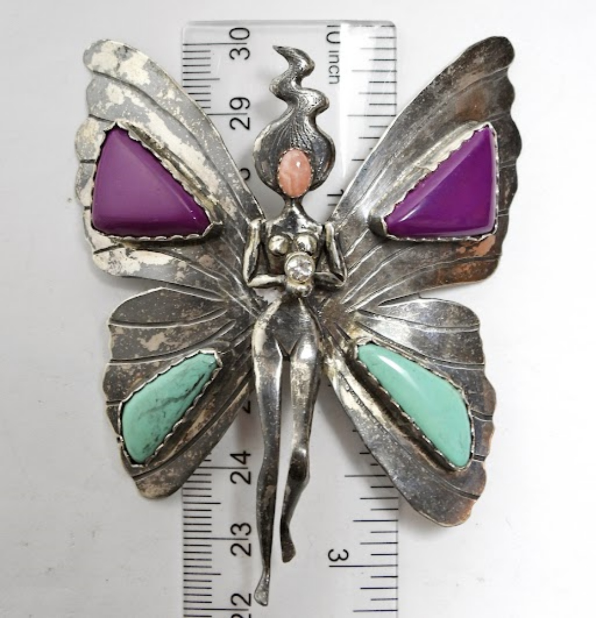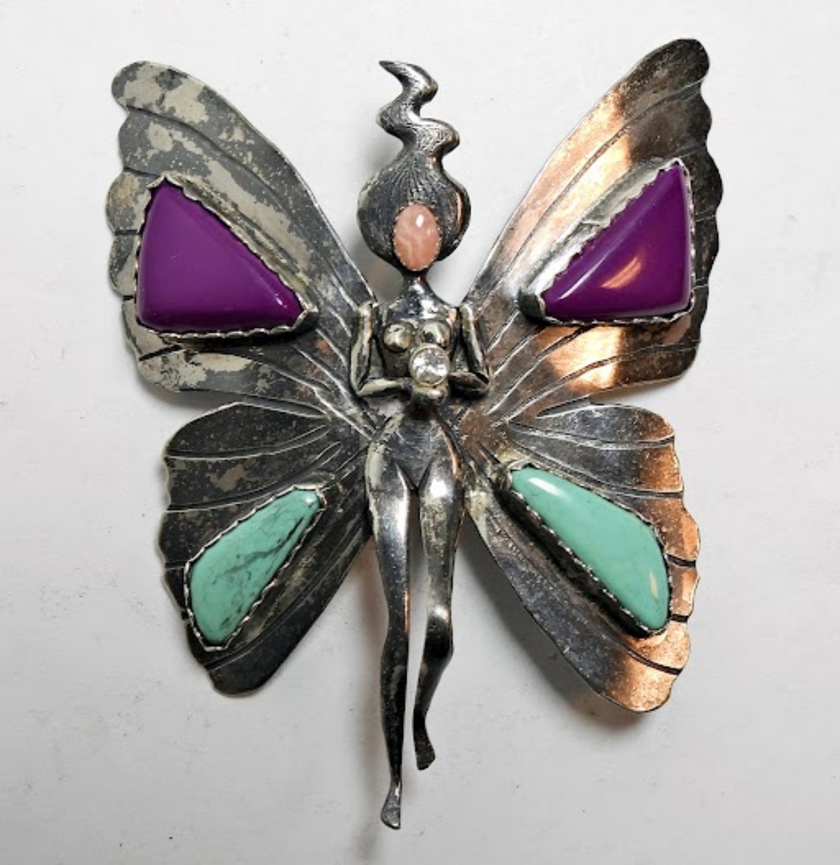 VINTAGE STERLING BROOCH/PENDANT, FAIRY WITH PURPLE & BLUE GEMSTONE WINGS. MARKED STERLING. 3″x2.5″. 19.5 DWT