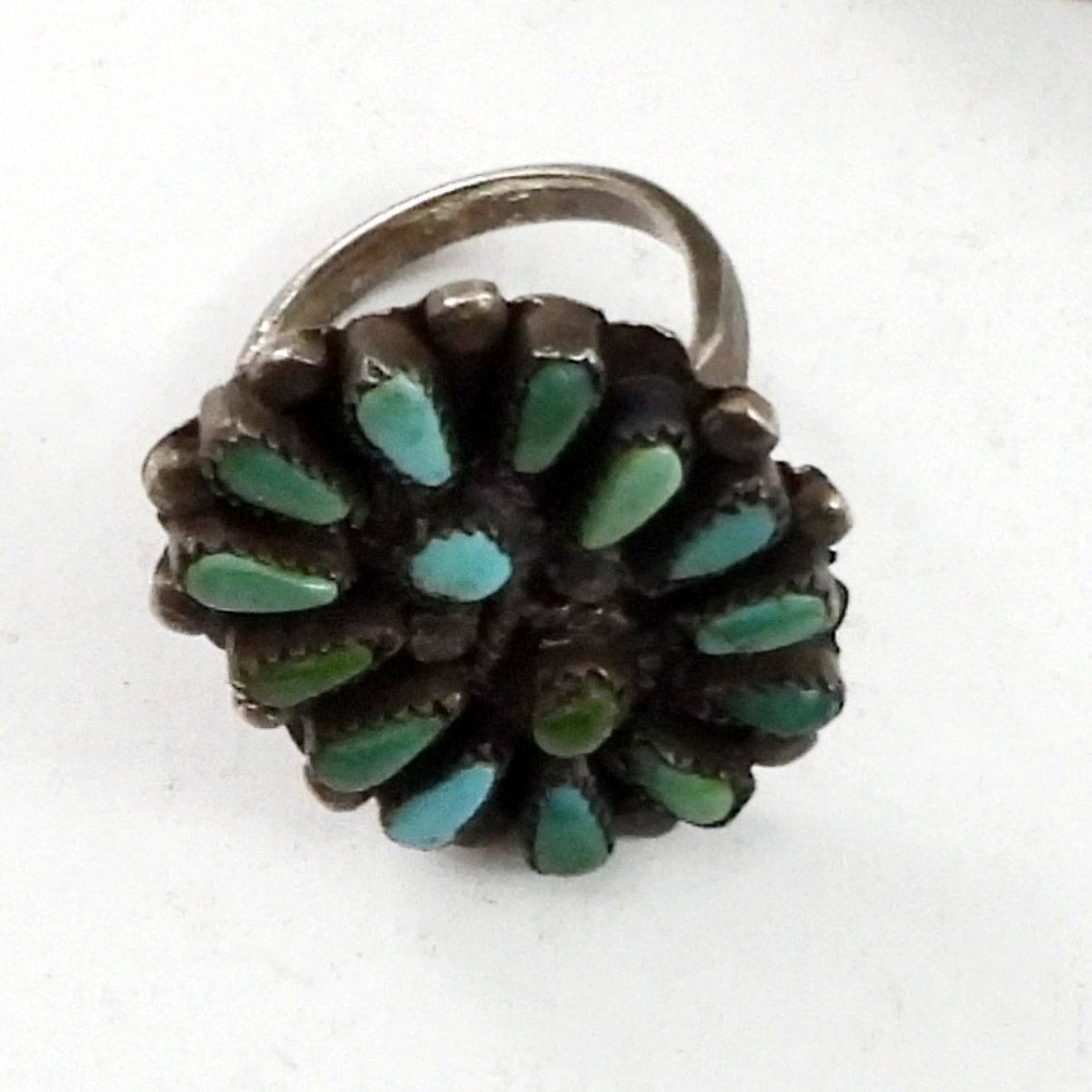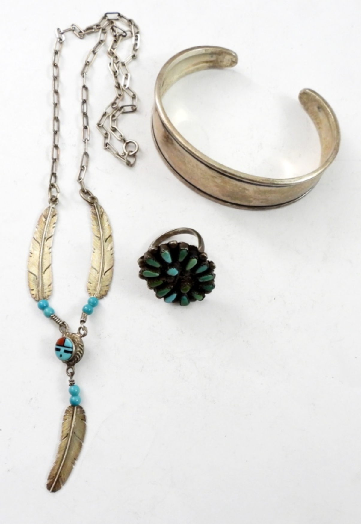 VINTAGE 16 IN STERLING FEATHER NECKLACE WITH TURQUOISE LIKE STONES, A STERLING CUFF BRACELET.AND A SIZE 6 RING WITH BLUE / GREEN STONES.30.6 DWT