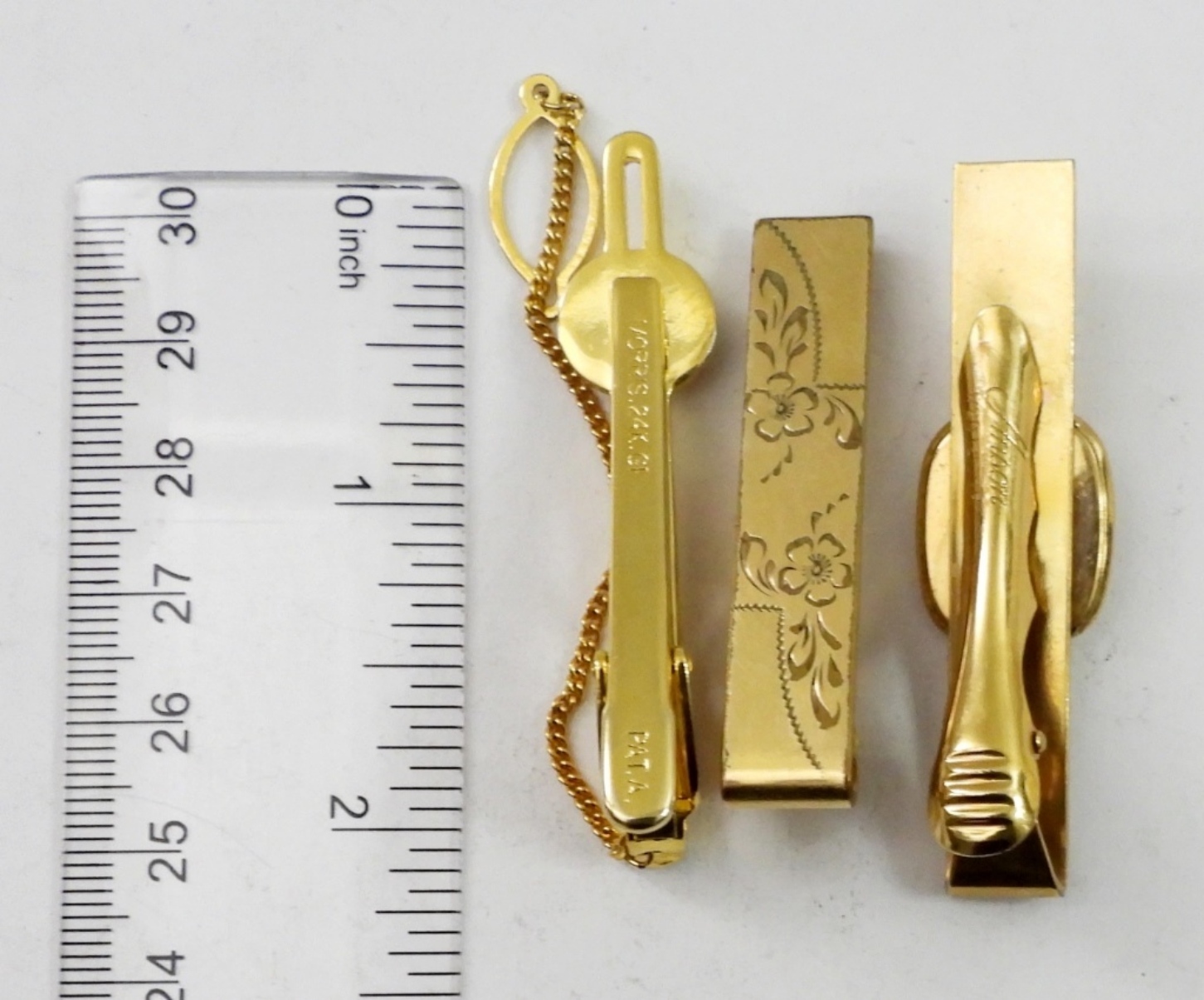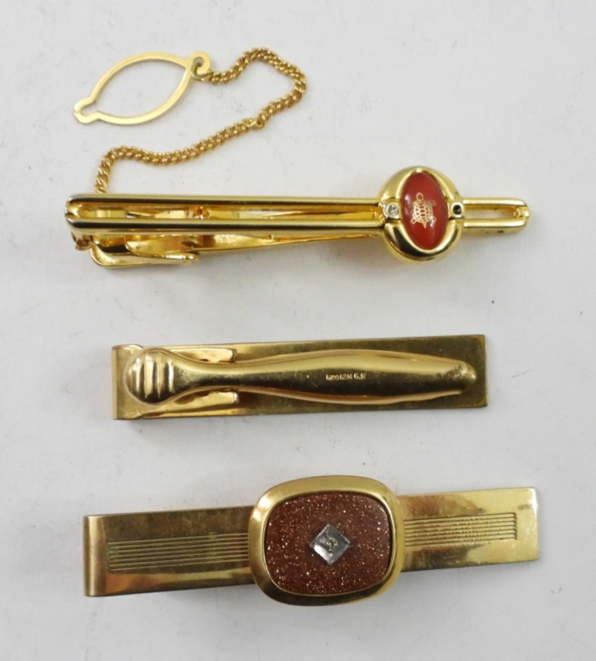 3 GOLD FILLED TIE TACKS. MARKED; “ANSON 1/20 12K GF”, “1/20 12K GF” & “MORRIS 24K GF”. 16.2 DWT