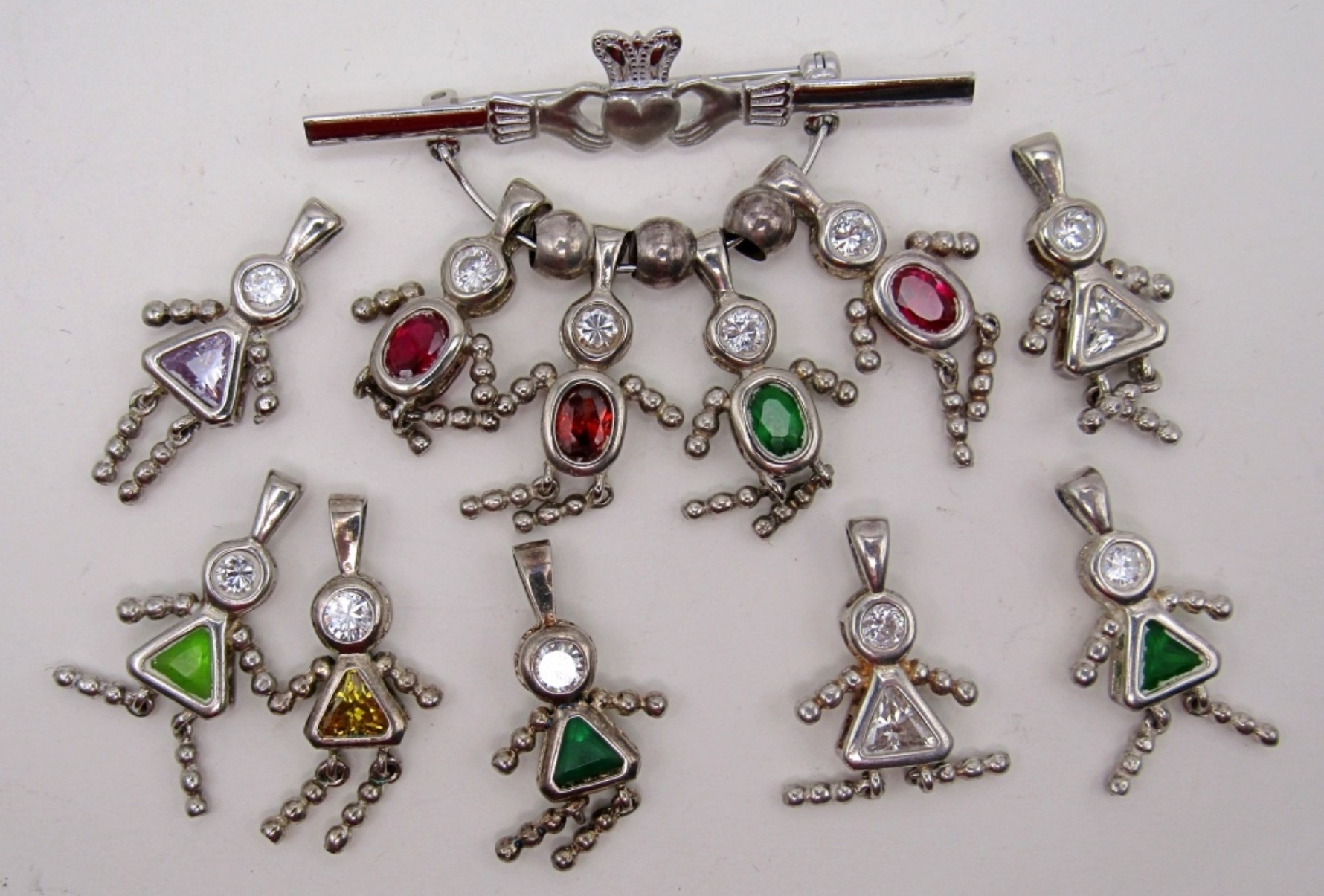 11 STERLING SILVER BIRTHSTONE BABIE CHARMS PLUS A PIN, 17.8 DWT