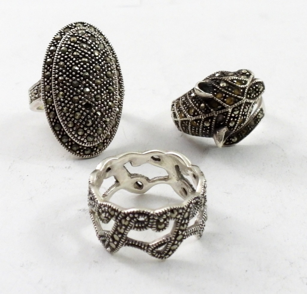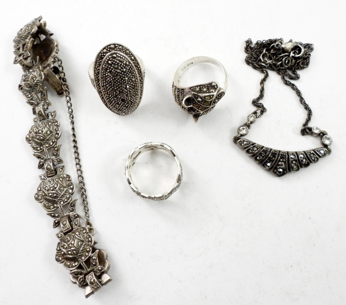 PANTHER RING SIZE 8, OVAL RING SIZE 7 missing 1 gem, “L” INITIAL RING SIZE 7, ROSE BRACELET 7″, NECKLACE 16″ (33 DWT)
