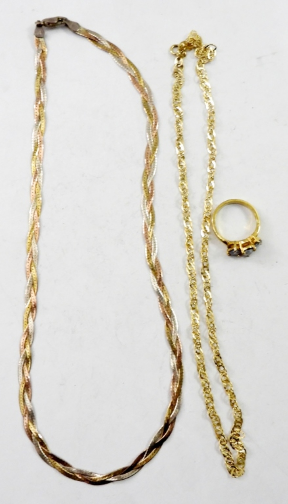 16 IN GOLD TONE STERLING CHAIN,16 IN 2 TONE STERLING NECKLACE,SIZE 7 GOLD TONE STERLING RING WITH BLUE STONES.10.8 DWT