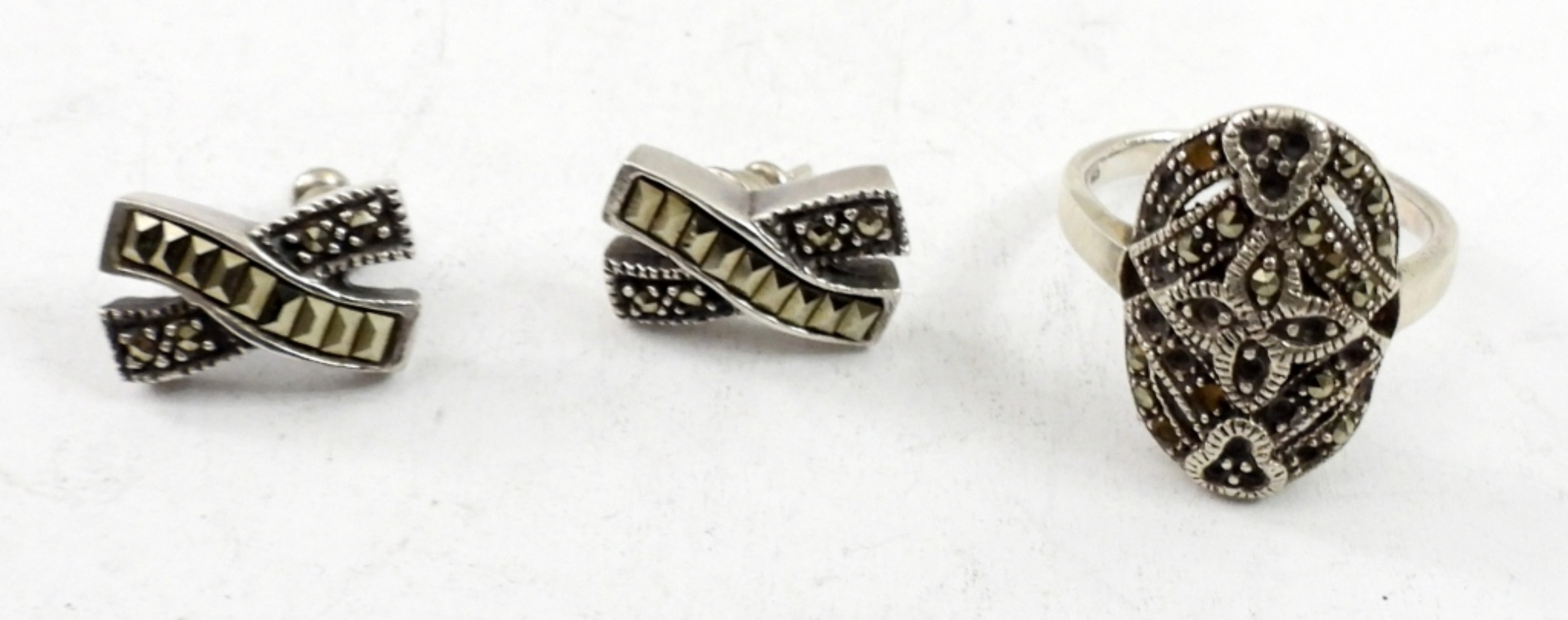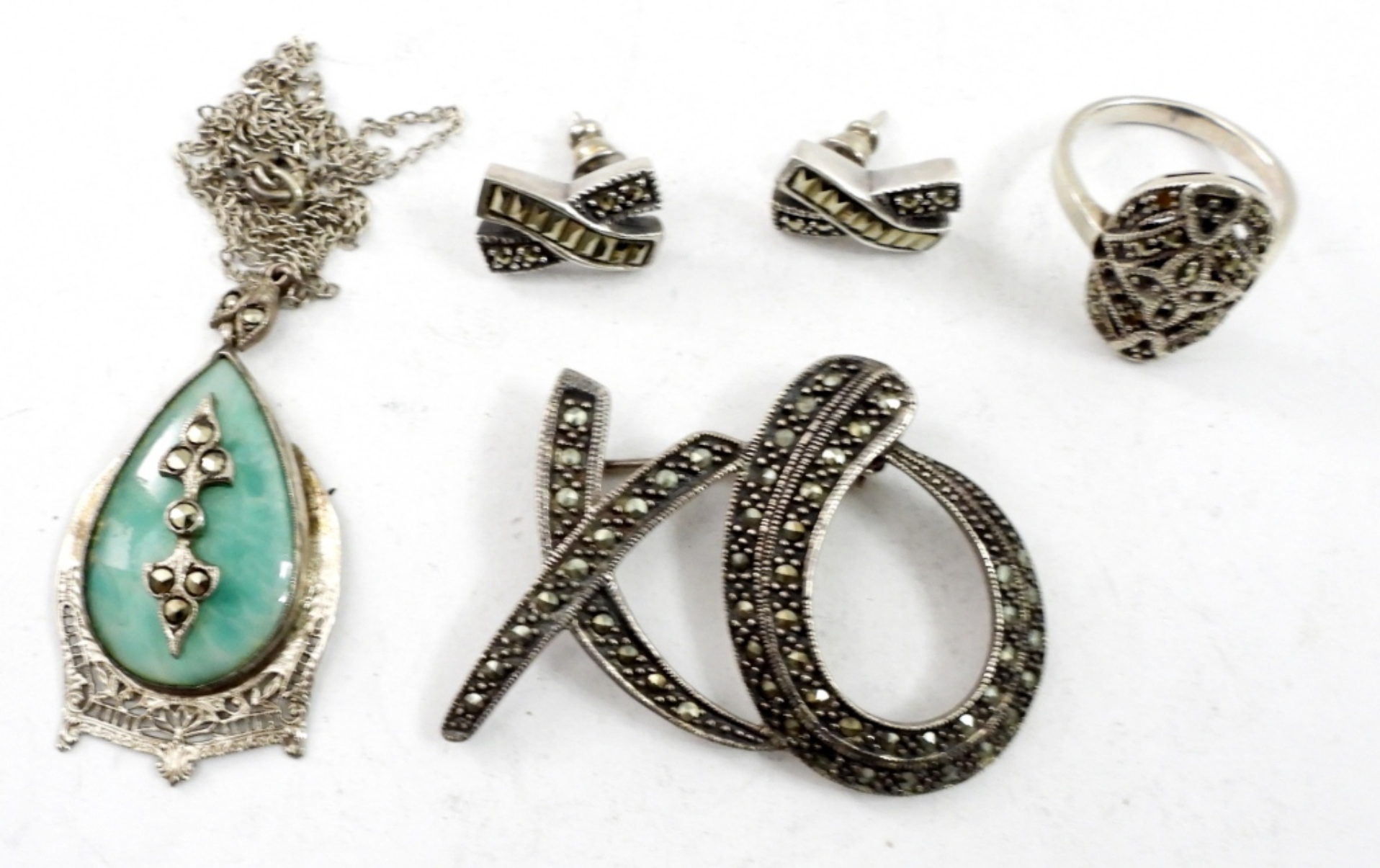 VINTAGE MARCASITE JEWELRY LOT. XO BROOCH, X EARRINGS, RING SIZE 7.5. VINTAGE GEMSTONE PENDANT ON AN 18″ CHAIN (CHAIN IS KNOTTED). 18.8 DWT