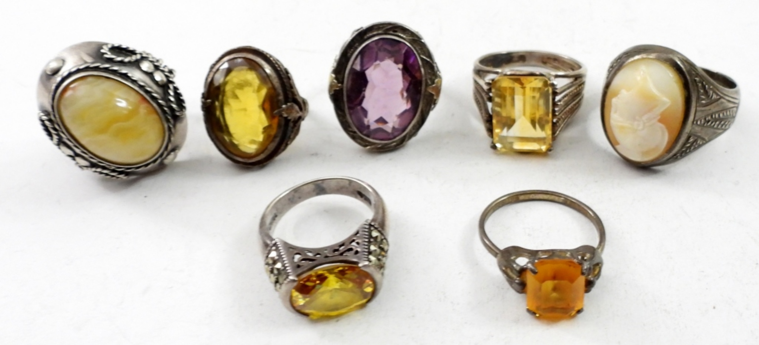 SEVEN STERLING GEMSTONES RINGS, VERY PRETTY. SIZES 6-10. ONE STERLING VINTAGE CAMEO BROOCH. 37.5 DWT