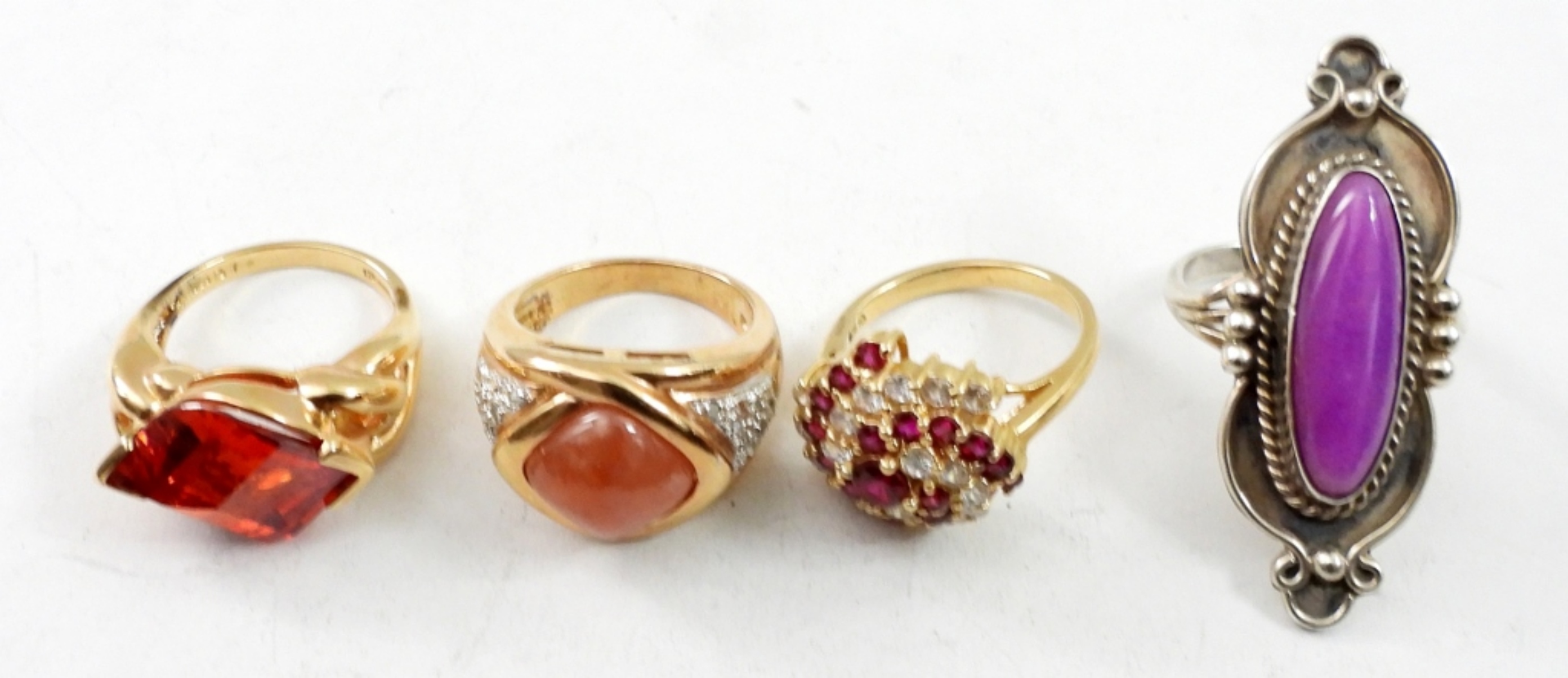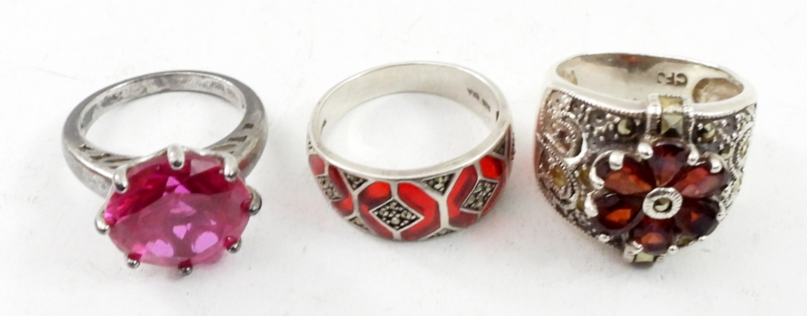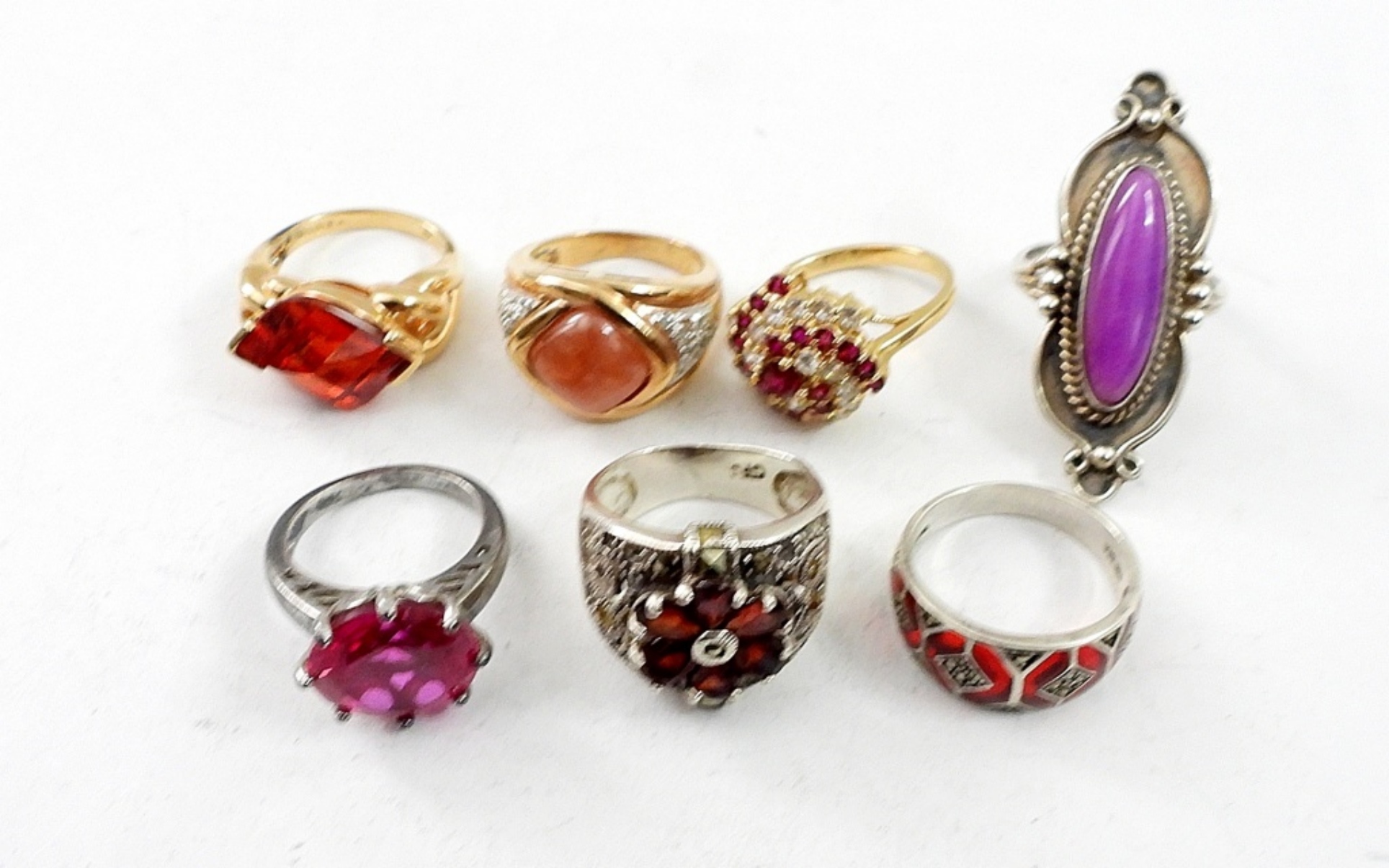SEVEN RED GEMSTONE STERLING SILVER RINGS. SIZES 7-9. 30 DWT