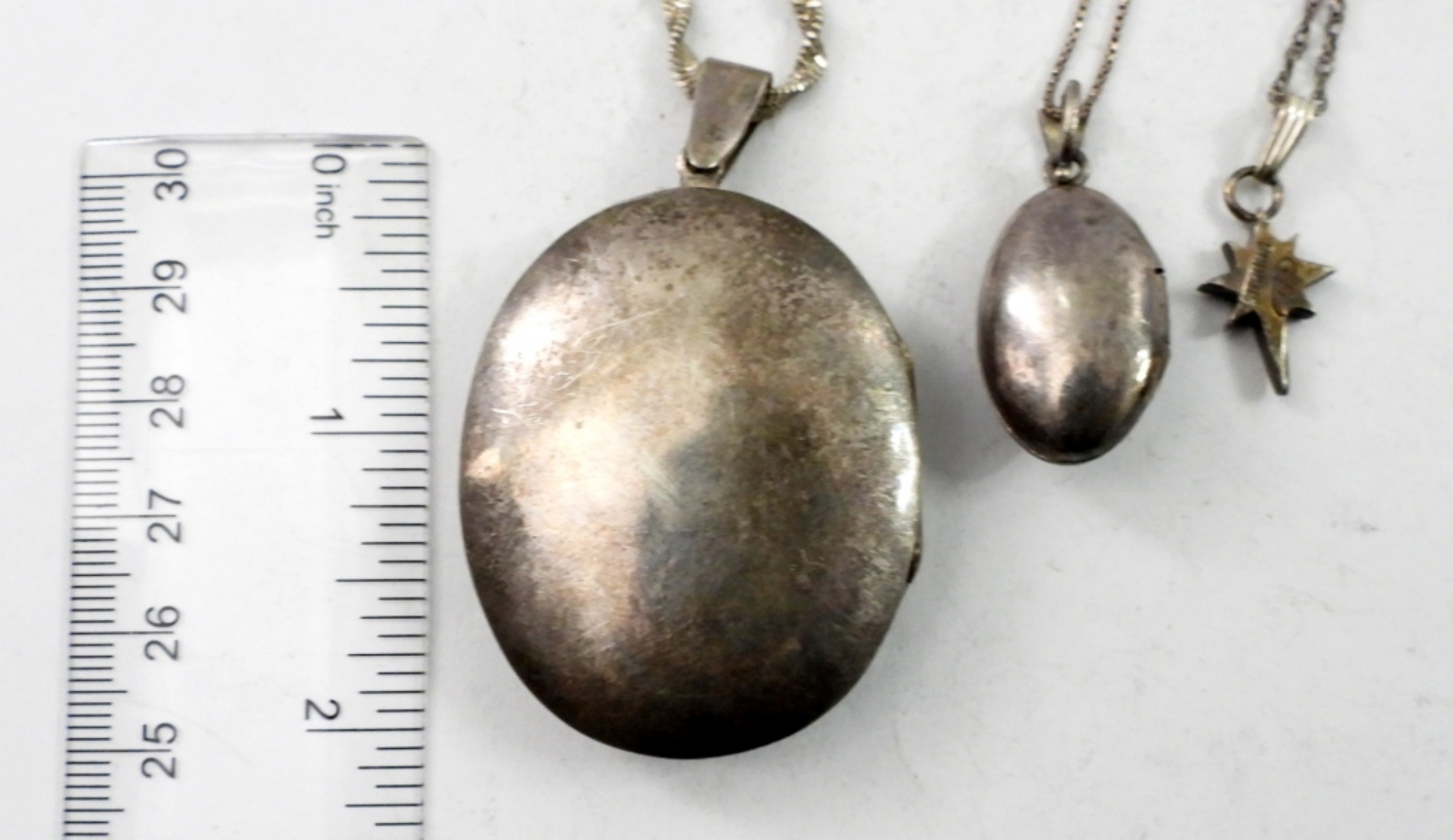 LARGE STERLING LOCKET ON A THICK 24″ CHAIN. OVAL STERLING LOCKET ON A STERLING 20″ CHAIN. STERLING STAR PENDANT ON A 20″ CHAIN. 27.7 DWT