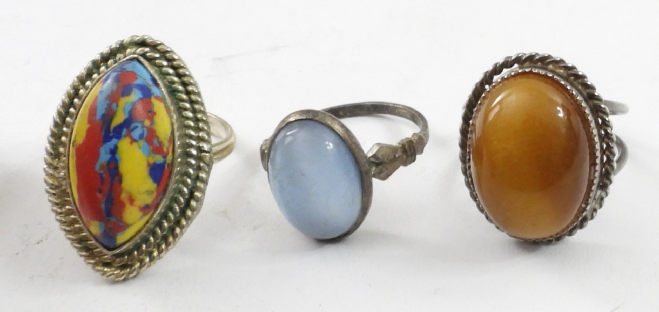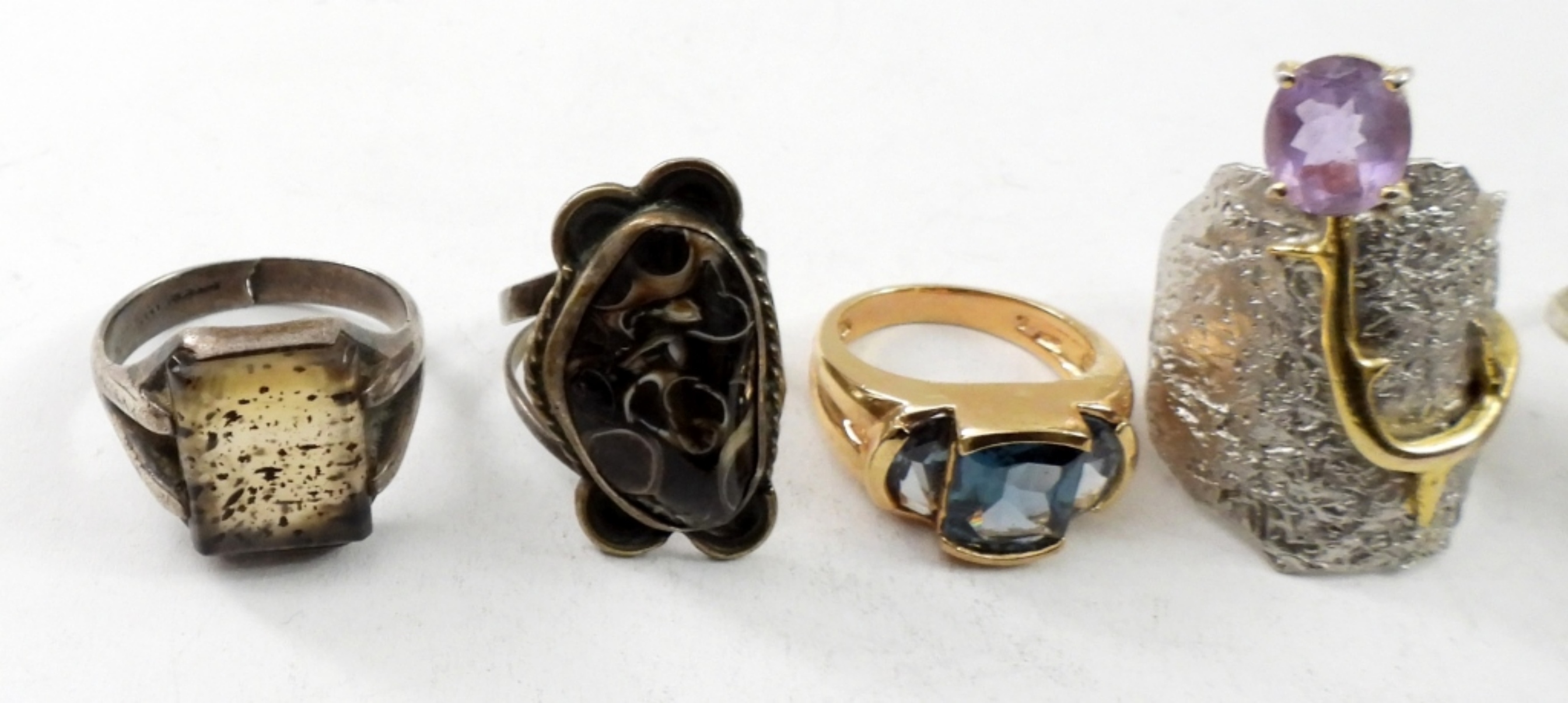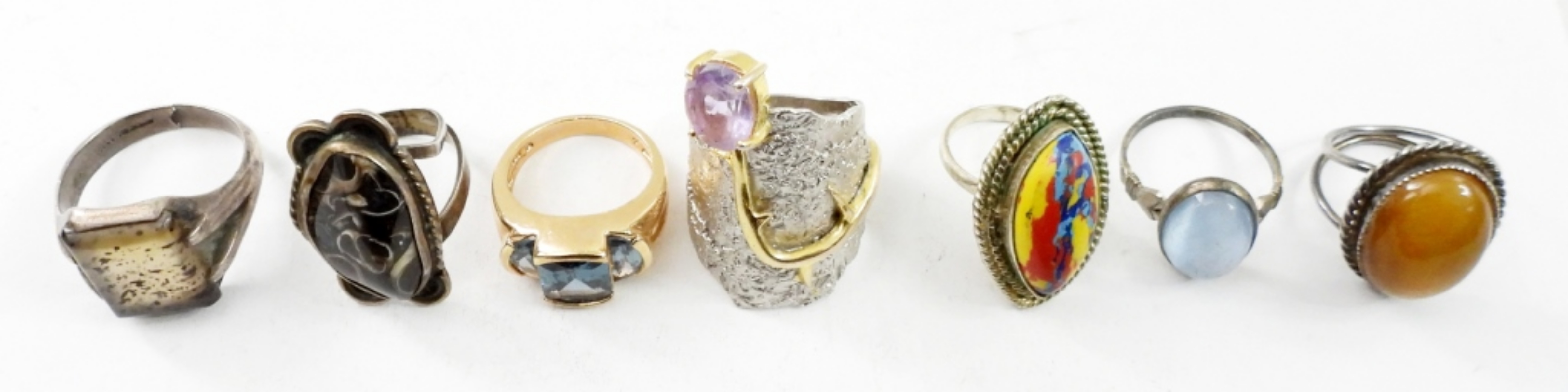 SEVEN STERLING GOLD AND SILVER TONE GEMSTONE RINGS. SIZES 5-12. 32 DWT