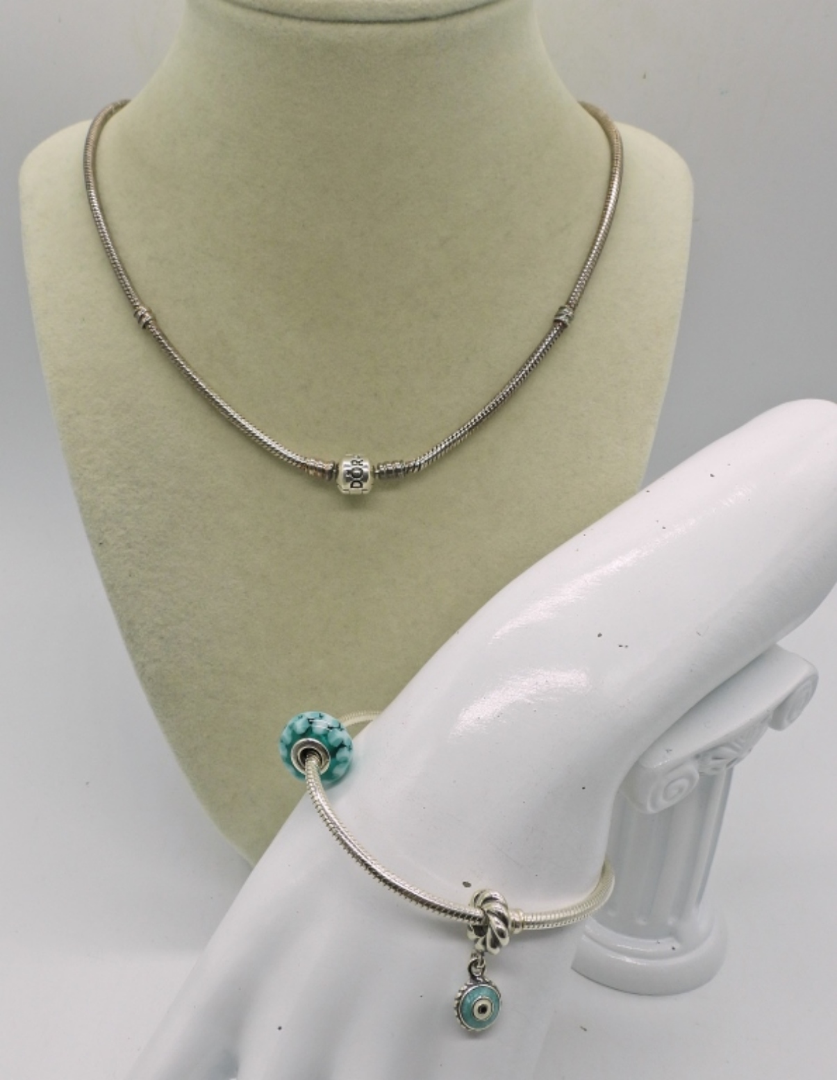 PANDORA STERLING CHARM NECKLACE & CHARM BRACELET WITH 2 CHARMS 20″ NECKLACE AND 7″ BRACELET 34.7 DWT