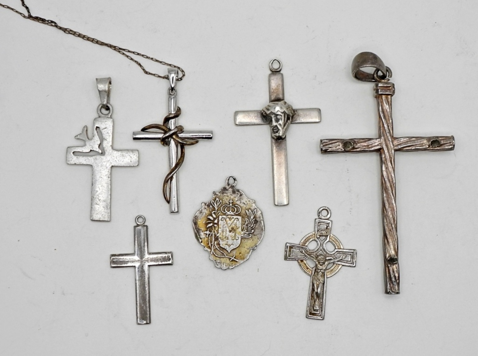6 STERLING SILVER CROSSES,1 QUEEN OF ALL HEARTS PENDANT 19.5DWT