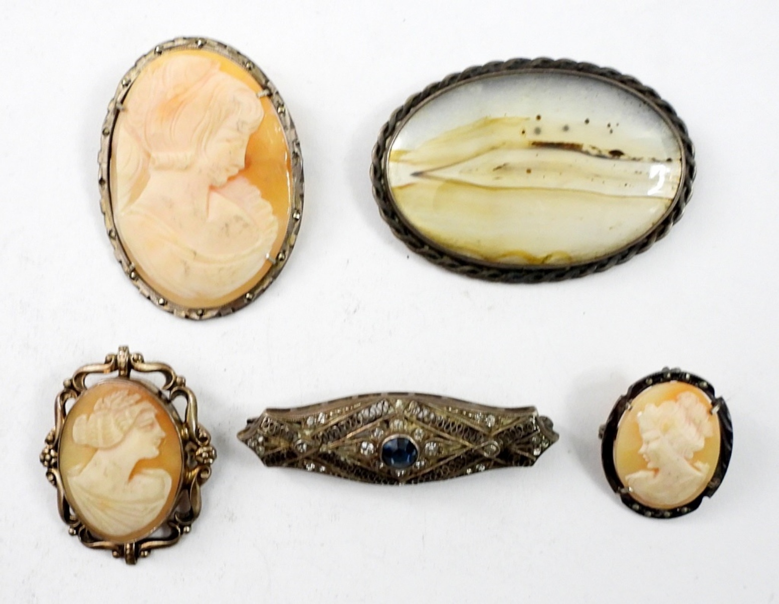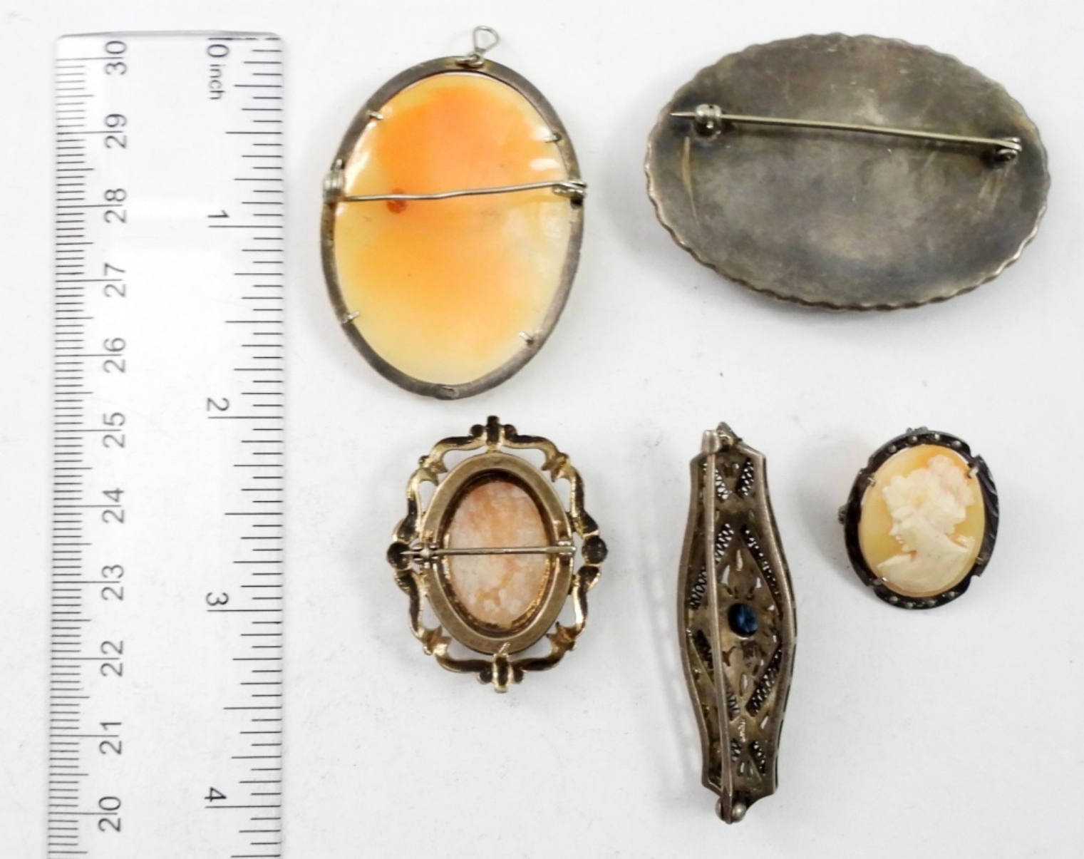 3 STERLING CAMEO BROOCHES, TWO OTHER VINTAGE BROOCHES. LARGEST MEASURES 2″ x 1.5″. 26.6 DWT