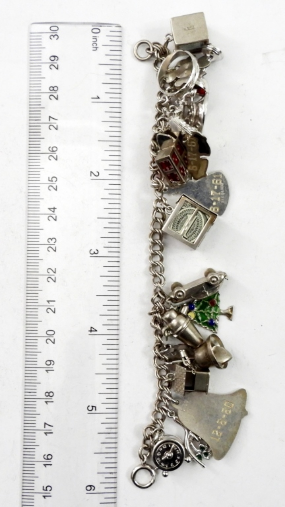6″ STERLING VINTAGE CHARM BRACELET WITH 19 STERLING CHARMS. 25.2 DWT