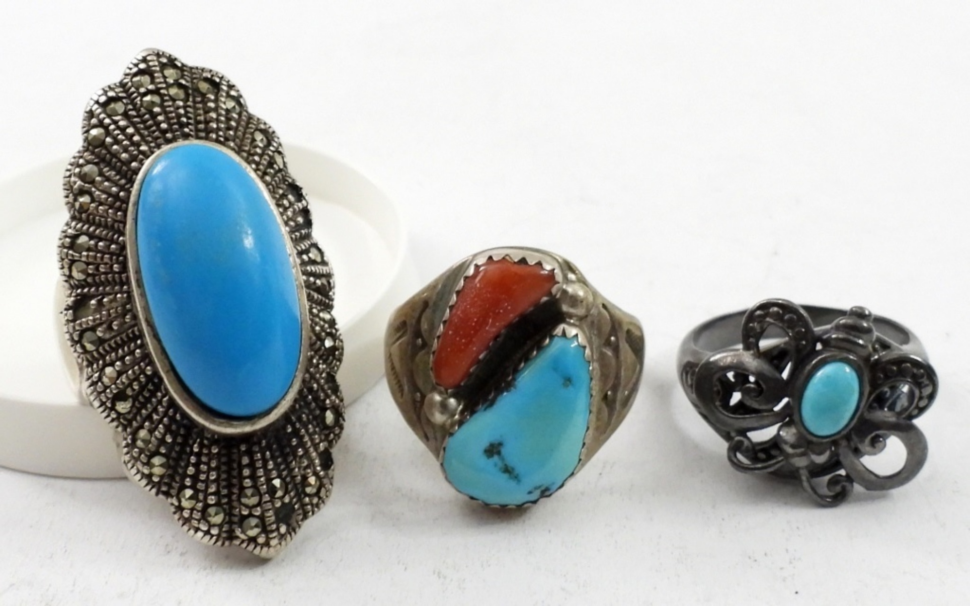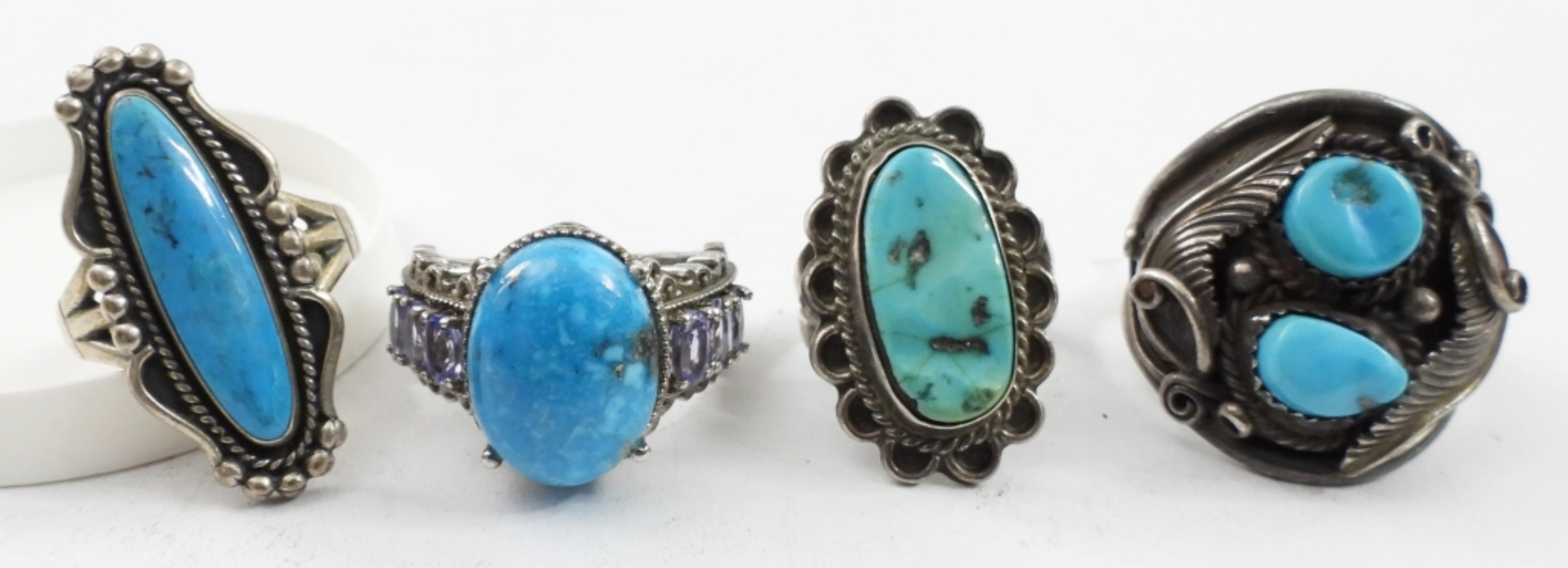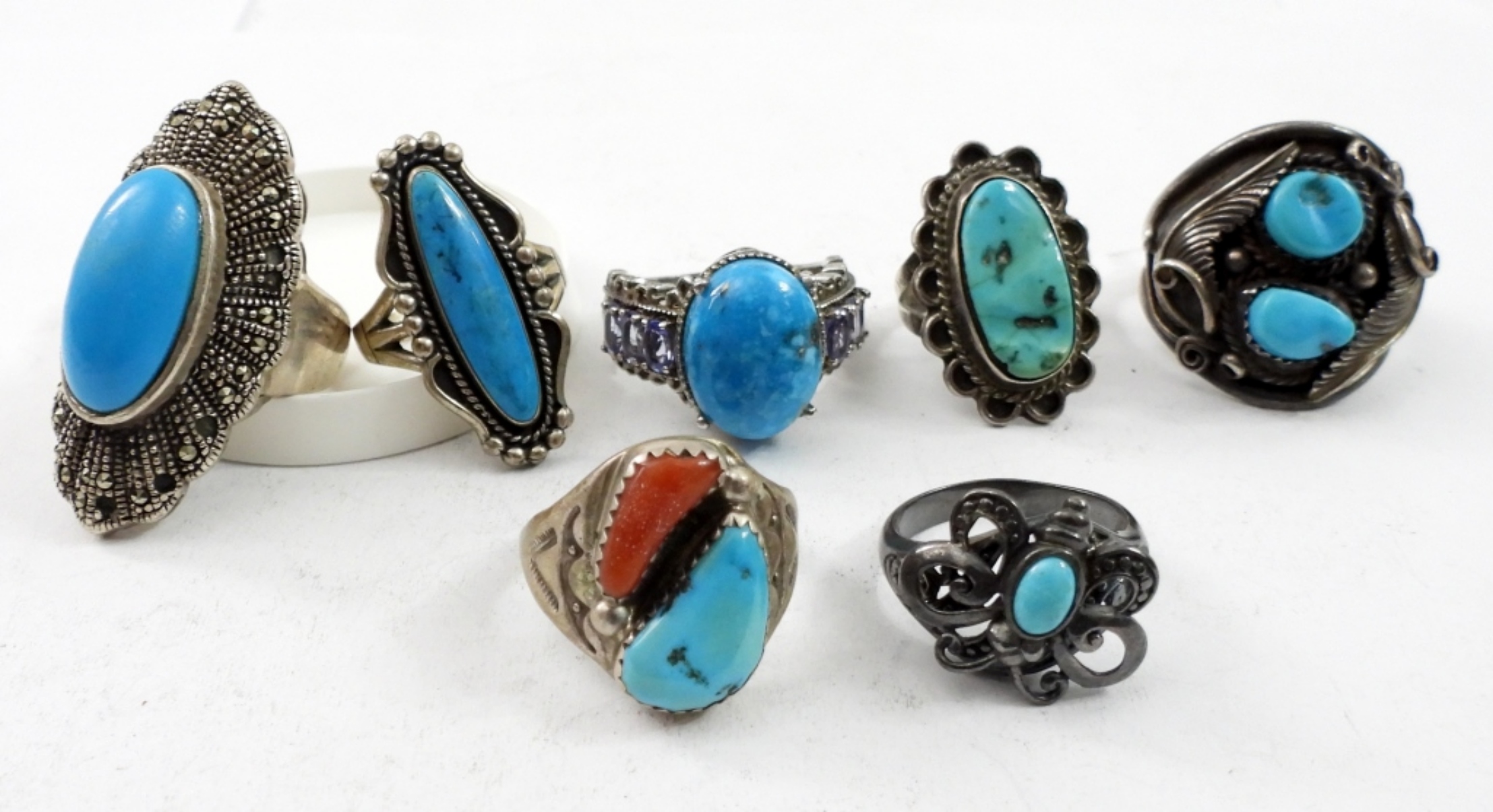 SEVEN STERLING RINGS WITH FAUX AND GENUINE TURQUOISE GEMSTONES. SIZES 6.5-11 (36.4 DWT)