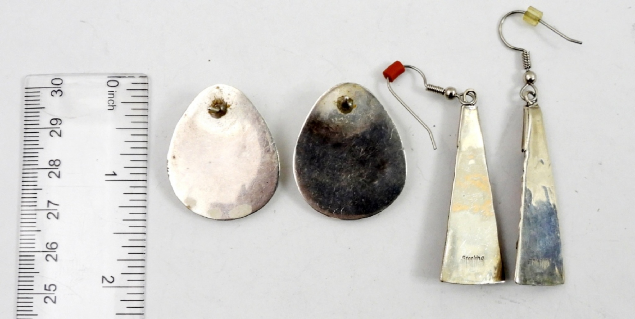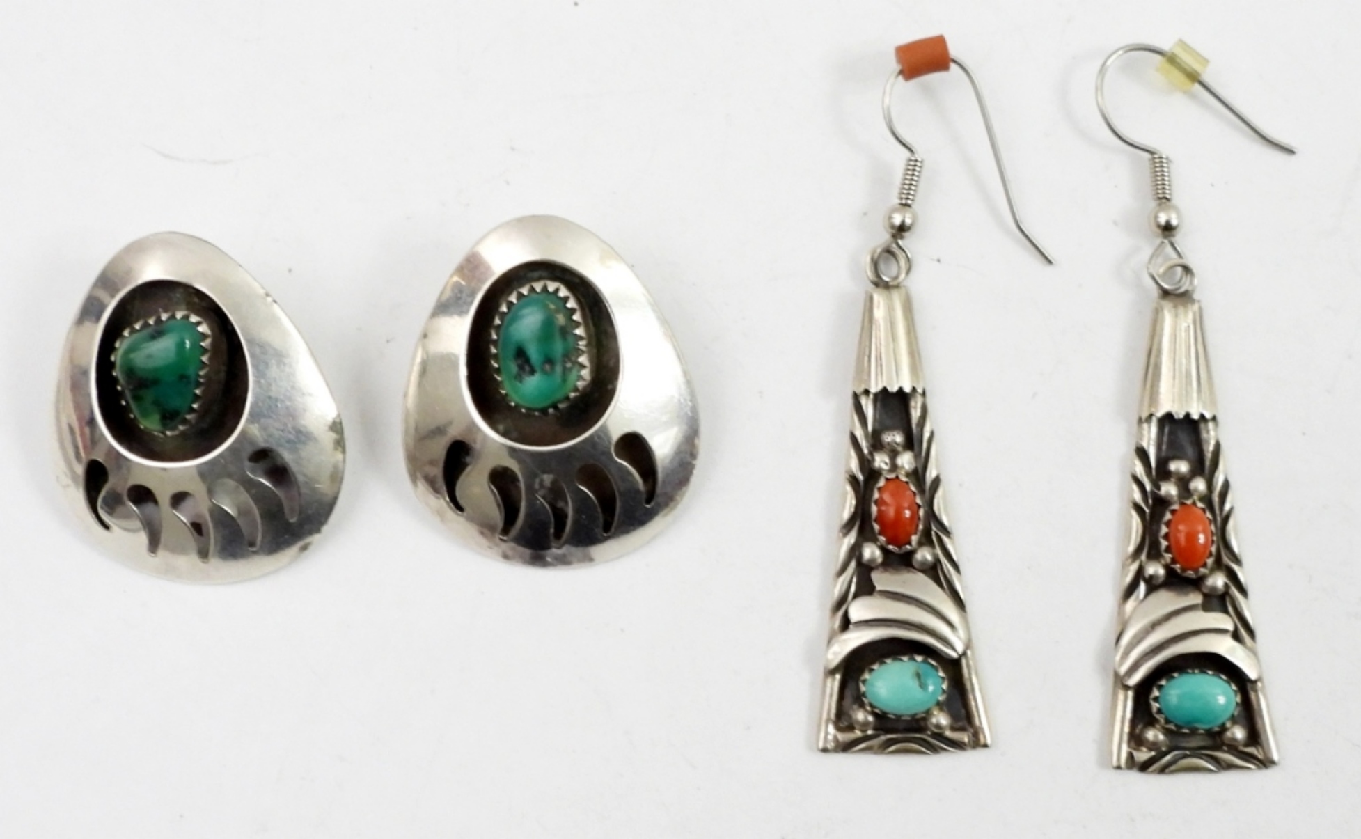 STERLING AND TURQUOISE BEAR CLAW POST EARRINGS, 1.5″. STERLING RED AND BLUE TURQUOISE DANGLE EARRINGS, 2.5″ LONG. 11.2 DWT