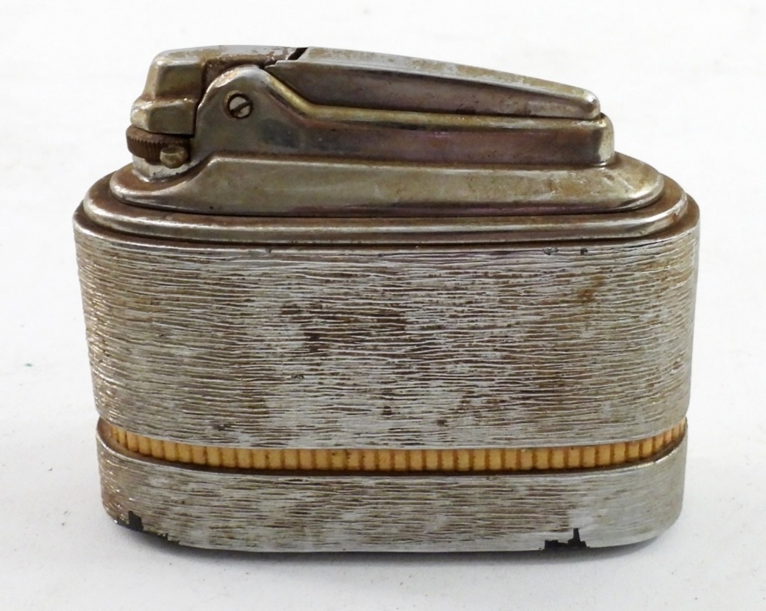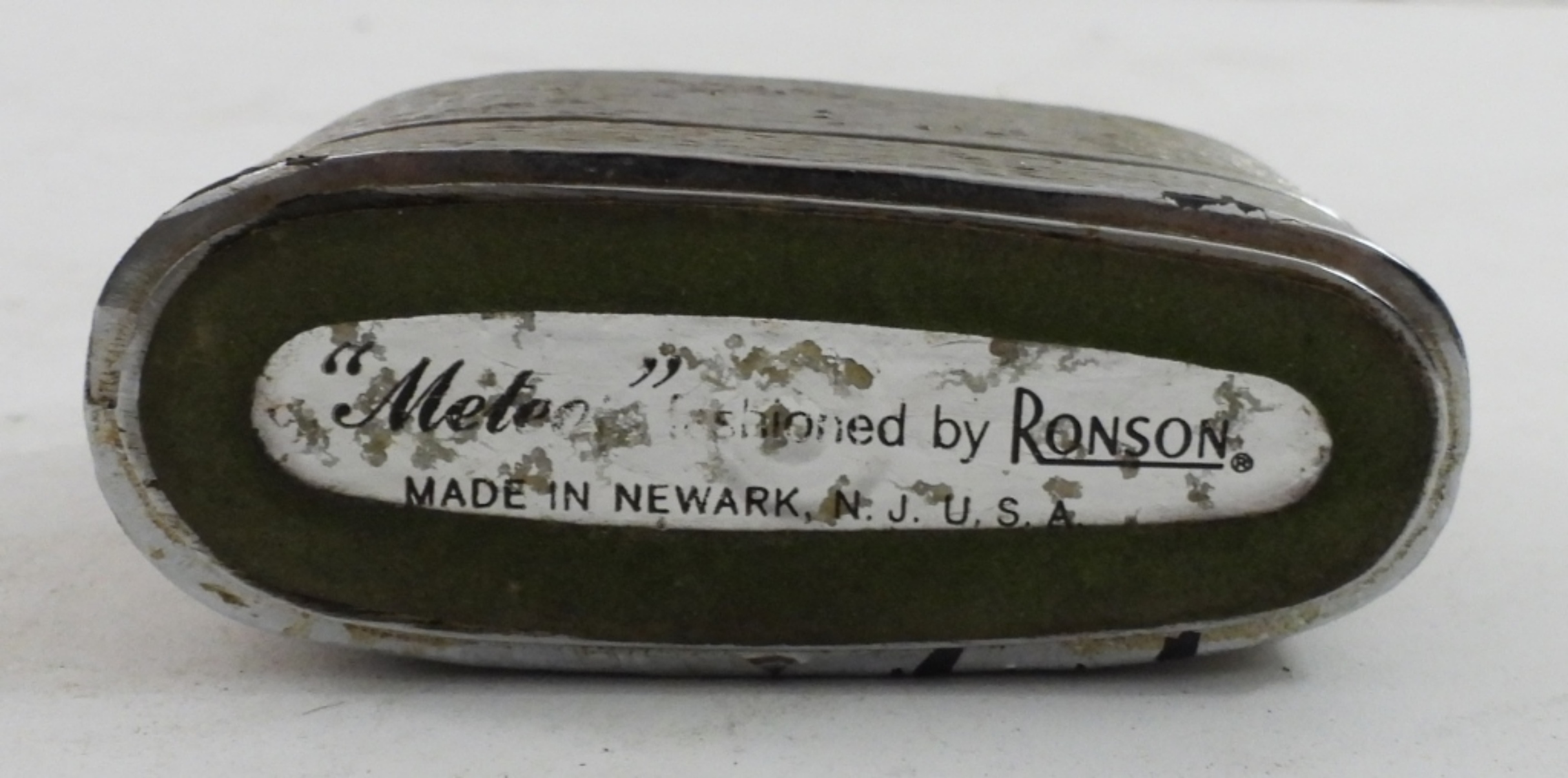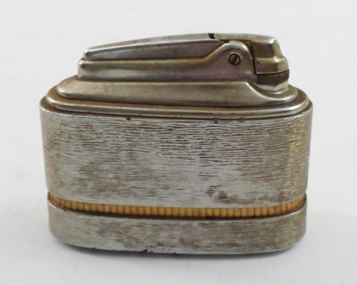 VINTAGE TABLE TOP LIGHTER, METEOR BY RONSON WITH GOLD BORDER. 3.5″ WIDE, 3″ TALL.