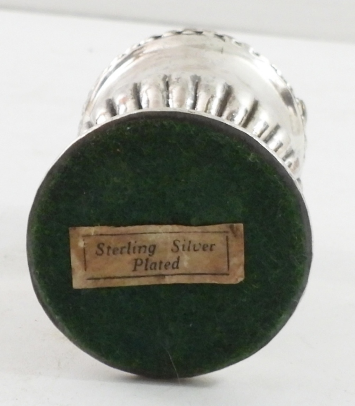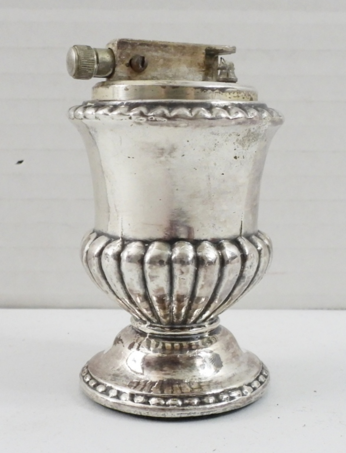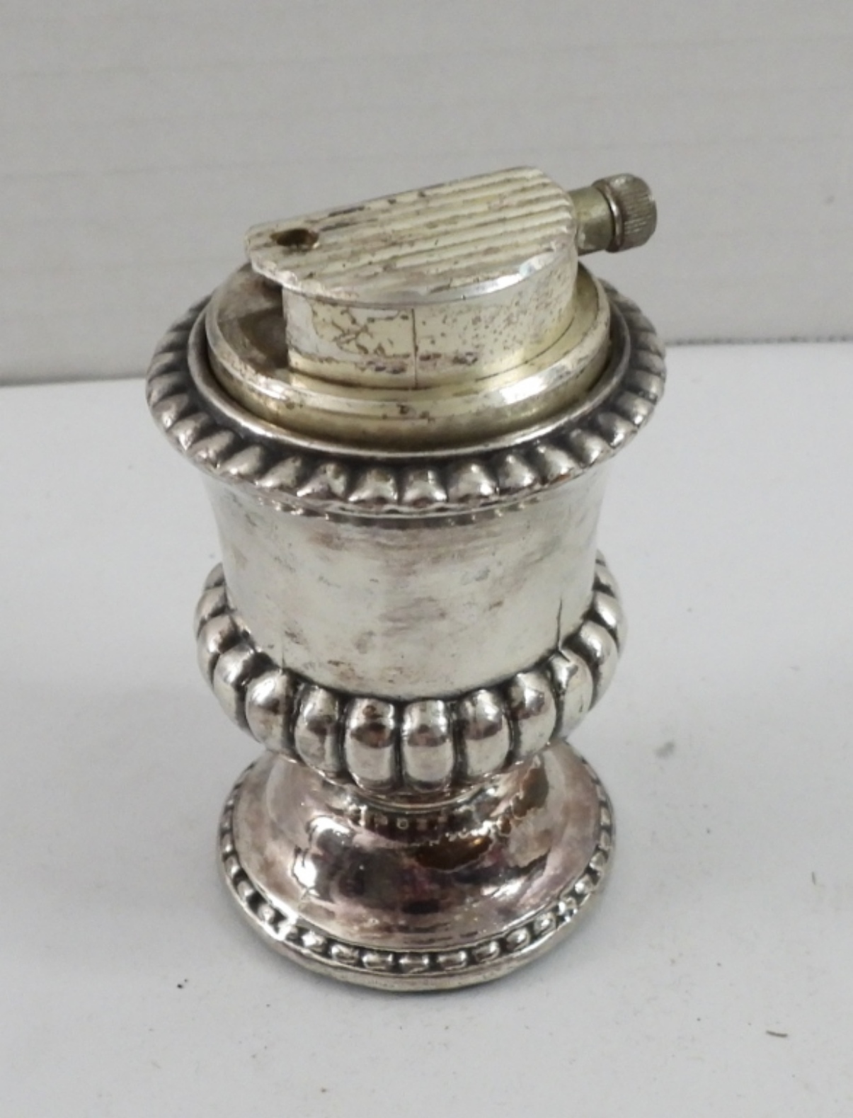 RONSON MAYFAIR TABLE LIGHTER, STERLING SILVER PLATED. 3.5″ TALL, CYLINDRICAL SHAPE. PROBABLY DOESN’T WORK.
